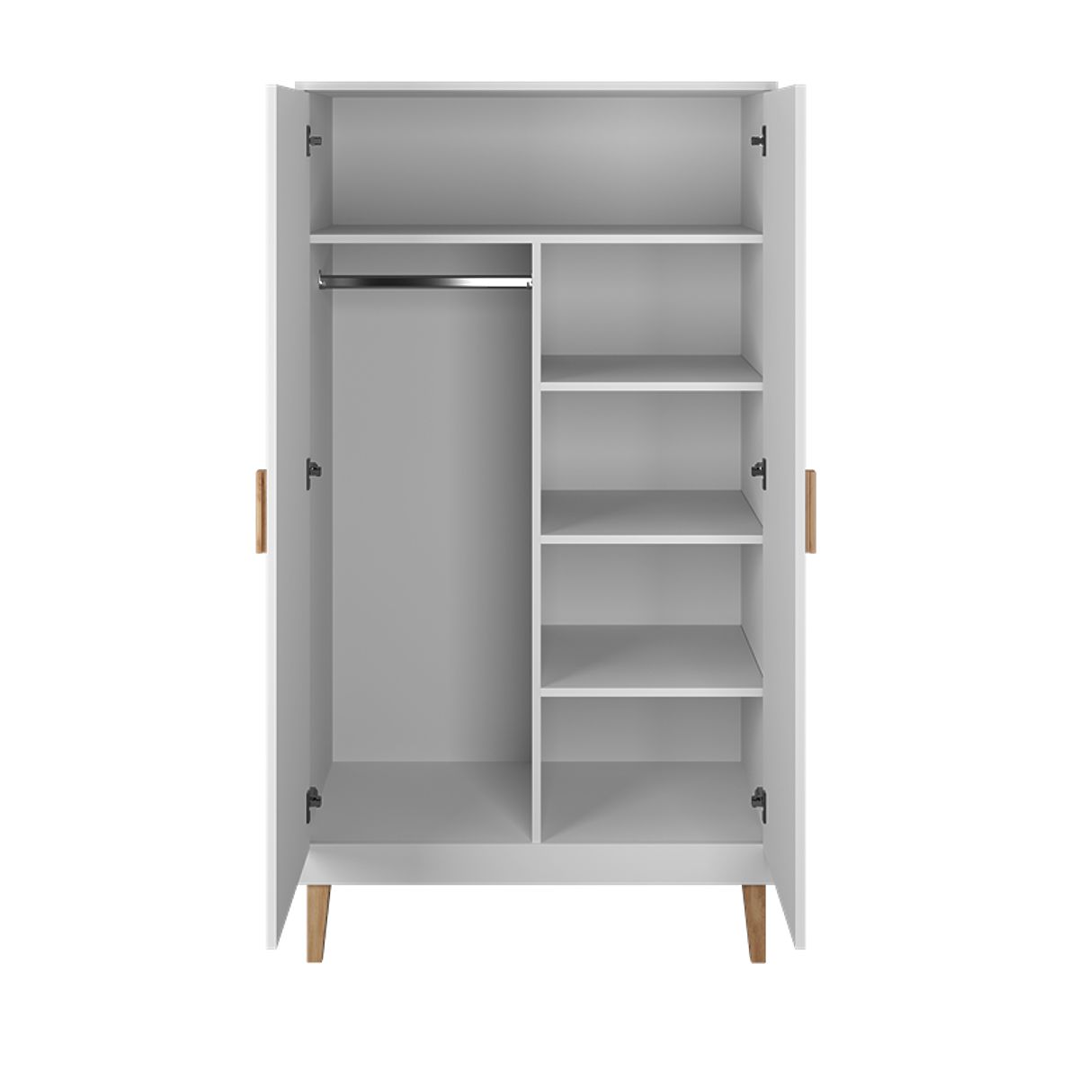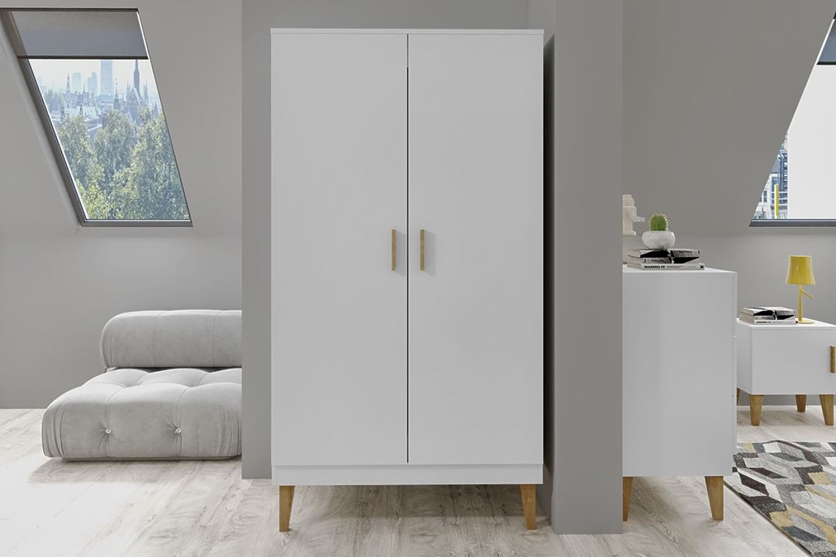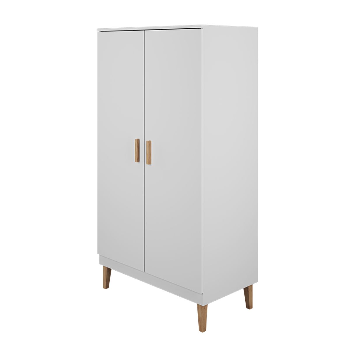 A hófehér kétajtós KUBI gardrób minőségi bútorlapból készült. A tömör tölgy lábak tökéletesen kiemelik a modern skandináv stílust, amelyet könnyedén összhangba hozhat bármilyen beltérrel.