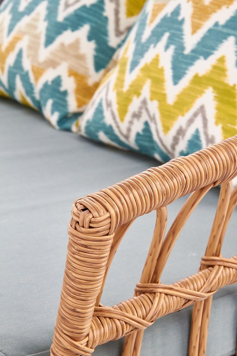A stabil szerkezetet fekete színű, porszórt acél alkotja, amelyet szintetikus rattan fon be. Kényelme érdekében a csomag tartalmaz egy puha textil ülőpárnát és két színes párnát.