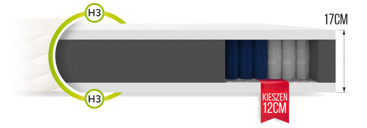 Kényeztesse magát kényelmes és zavartalan alvással a kétoldalas , 17 cm magas TREVISO táskamatraccal. A matrac magja a zsebforma. A zsebrugók NanoHARD technológiával készültek és a duplán edzett huzalnak köszönhetően élettartamuk jelentősen meghosszabbodik. A matracot 7 különböző keménységű zóna jellemzi, amely biztosítja a test ergonomikus helyzetét pihenés közben. A rugók egymástól függetlenül működnek, ami kiküszöböli a matrac nagy részének meghajlásának hatását, amikor nyomást gyakorolnak a matrac egy kis részére. Ennek köszönhetően nem fogja érezni a másik személy forgását, mozgását, ami mély és zavartalan alvást biztosít. A zsebbetétet T25 pur hab veszi körül, amely nagy deformációállósággal rendelkezik, rugalmas, jól lélegzik és stabilizálja a testet pihenés közben. A rugók és a hab közé elválasztó anyagot helyeztek. Ez egy természetes filc, amely jelentősen meghosszabbíthatja a matrac élettartamát és megerősítheti szerkezetét.