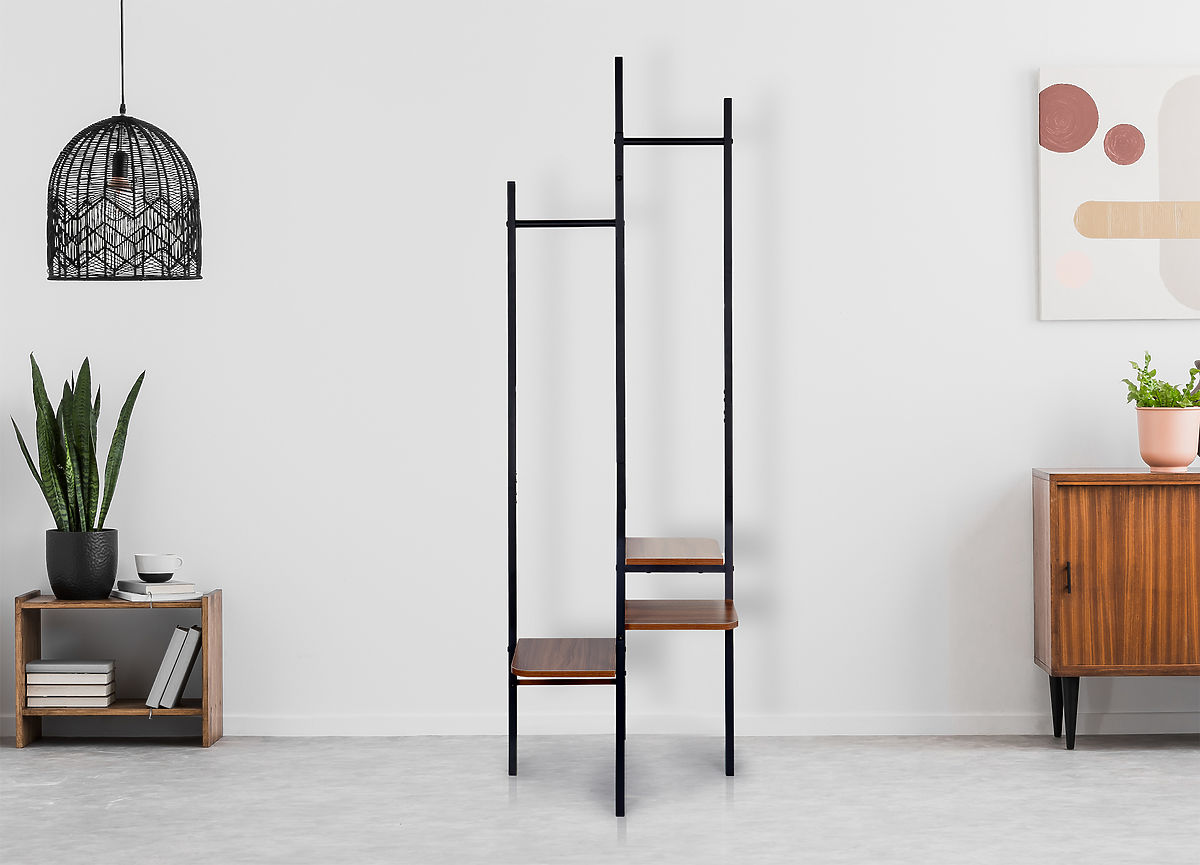 A polcok különböző magasságú elrendezése "lépcsős" hatást kelt. Különféle dekorációk, növények és kiegészítők, például cipők és női kézitáskák jól mutatnak rajtuk.