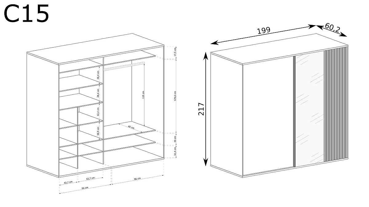 méretek: 199/60,2/216 anyag: lap – laminált bútorlap; fekete lap – laminált bútorlap (ajtók lamellákkal); él – ABS furnér; szekrény hátulja – HDF lap; lamella – MDF lécek; zsanérok – fém, csendes záródással