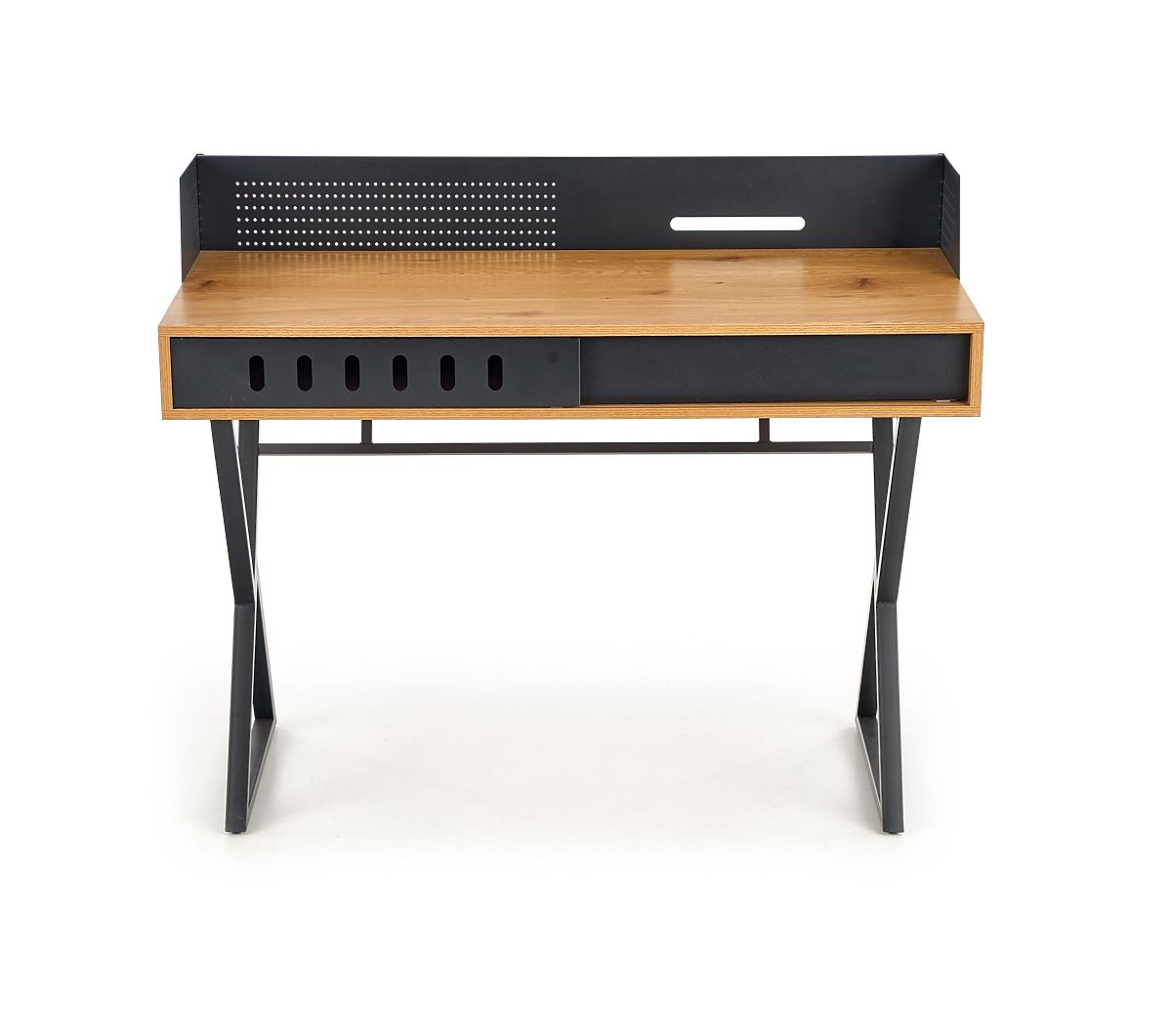 Modern íróasztal elegáns dizájnnal, amely az arany tölgy és a fekete színt ötvözi. Furnérozott MDF-ből és porszórt acélból készült, ami magas minőséget és tartósságot biztosít. Ideális otthoni irodába vagy dolgozósarokba.