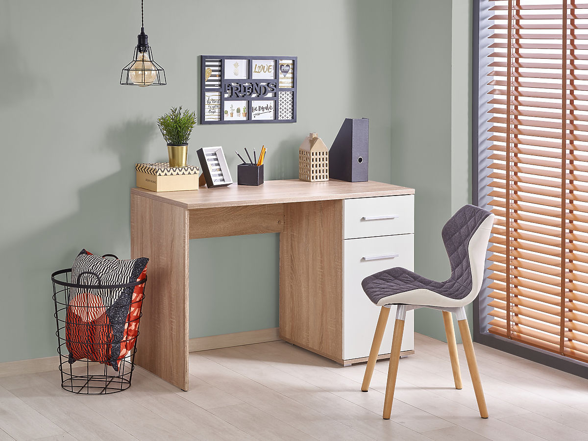Stílusos íróasztal sonoma tölgy/fehér színben, amely ötvözi a modern megjelenést és a praktikus tulajdonságokat. Laminált bútorlapból készült ABS élekkel, ideális hatékony munkavégzéshez és szervezéshez.