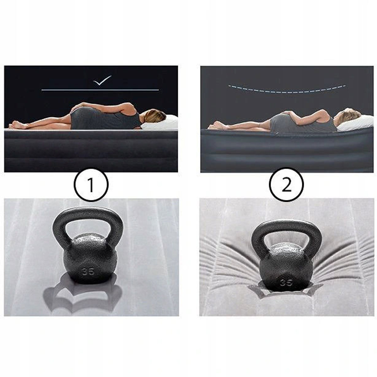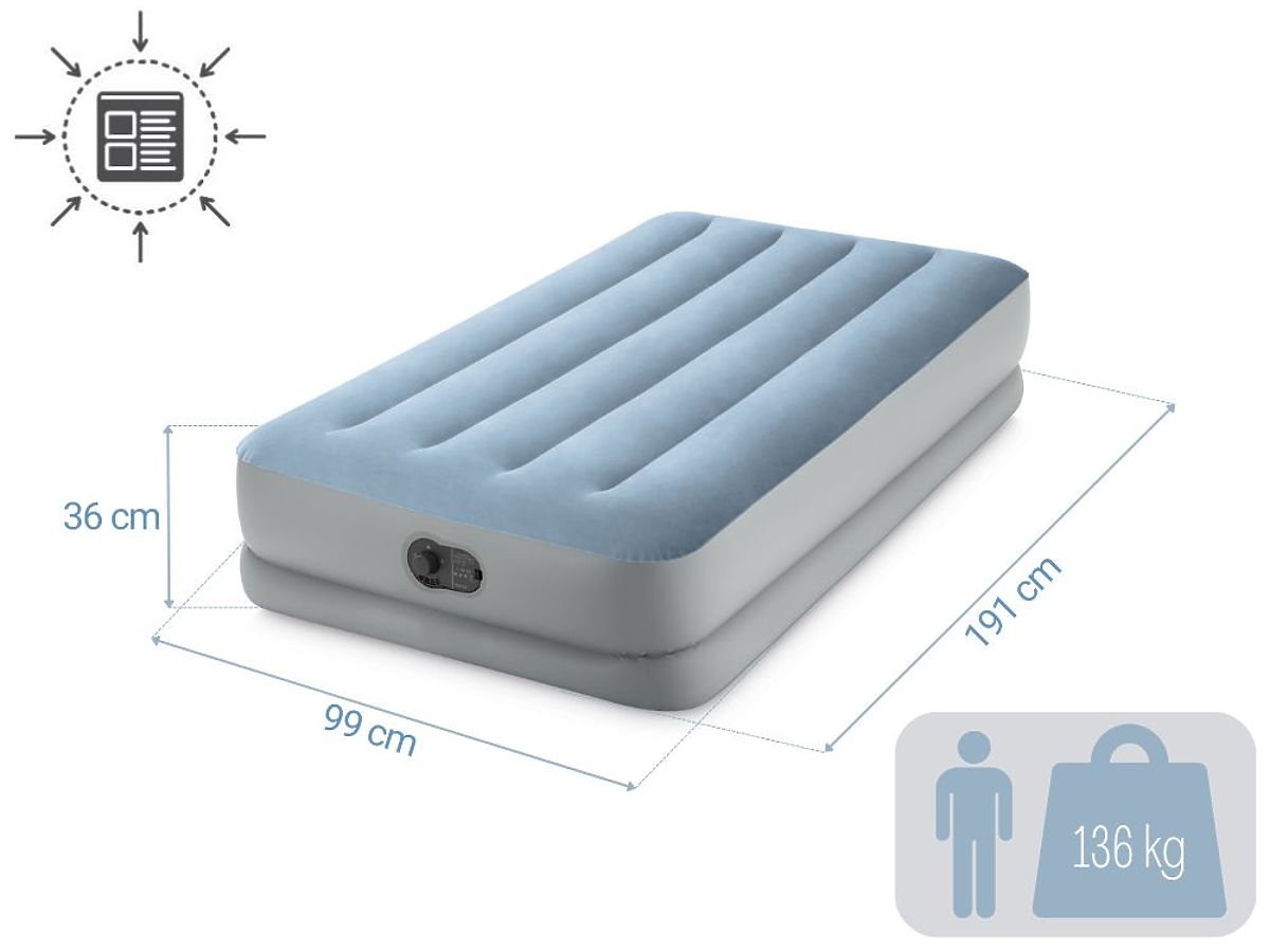 Az INTEX 64157 felfújható matrac minden helyzetben ideális megoldás – kiválóan szolgál ideiglenes vendégágyként, kényelmes alvóhelyként utazás közben, valamint komfortos fekhelyként kempingezéskor vagy nyaralóban. Nagy méretei és szilárd szerkezete révén magas alvási kényelmet biztosít egy felnőtt személy számára, anélkül, hogy besüppedne vagy levegőt veszítene. Gyors felfújása és kompakt tárolása miatt praktikus és univerzális választás mindenkinek, aki értékeli a kényelmet és a mobilitást.