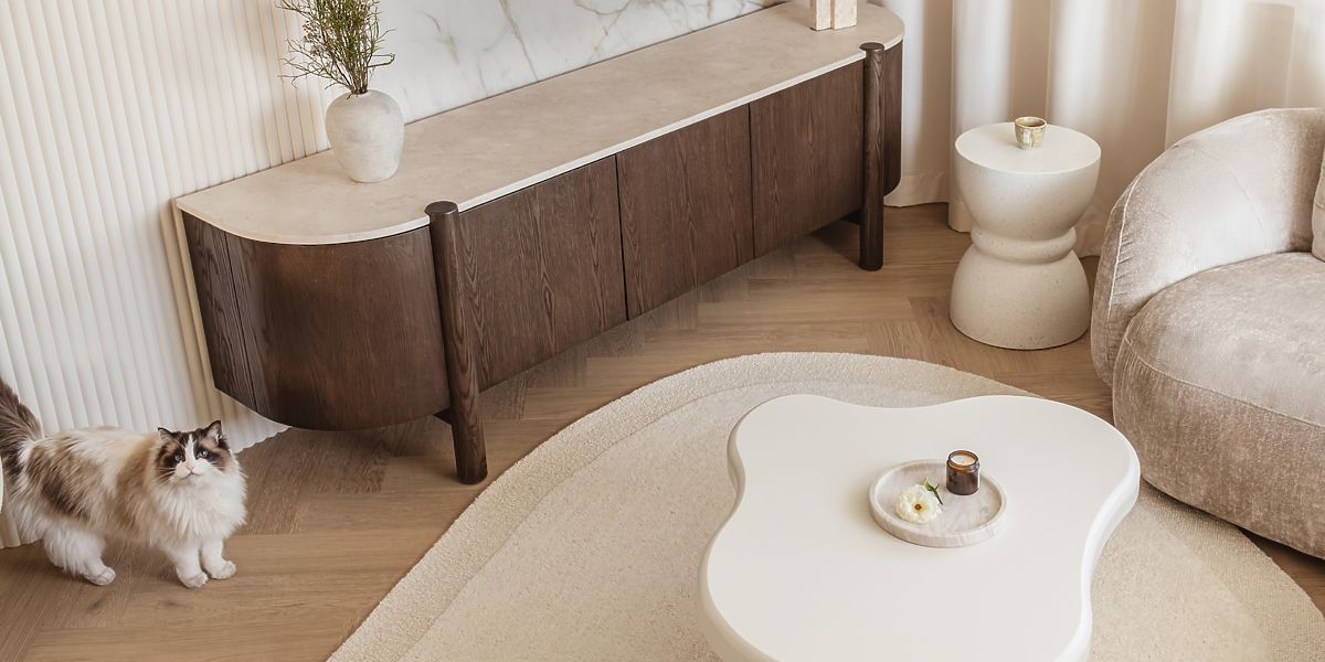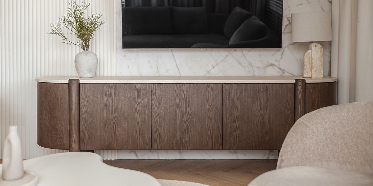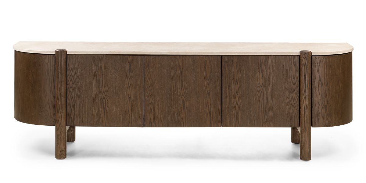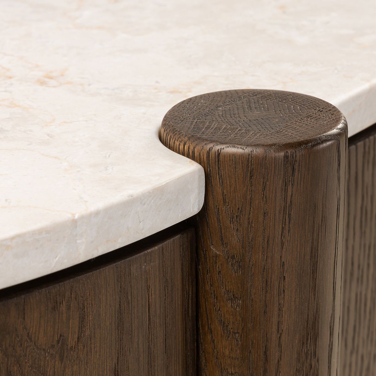 Lekerekített Bruna TV szekrény mocha tölgy és krém márvány felülettel. .. többet