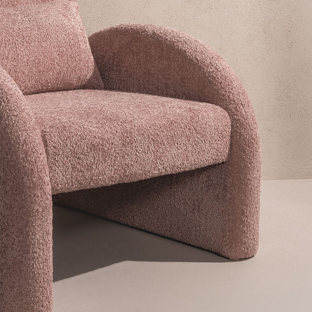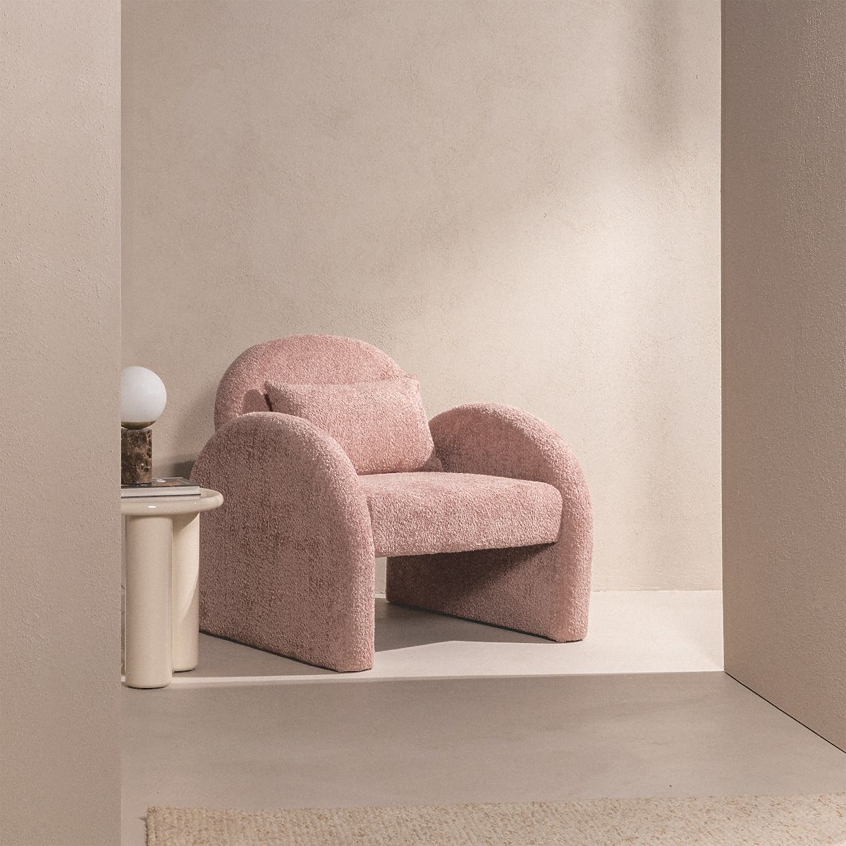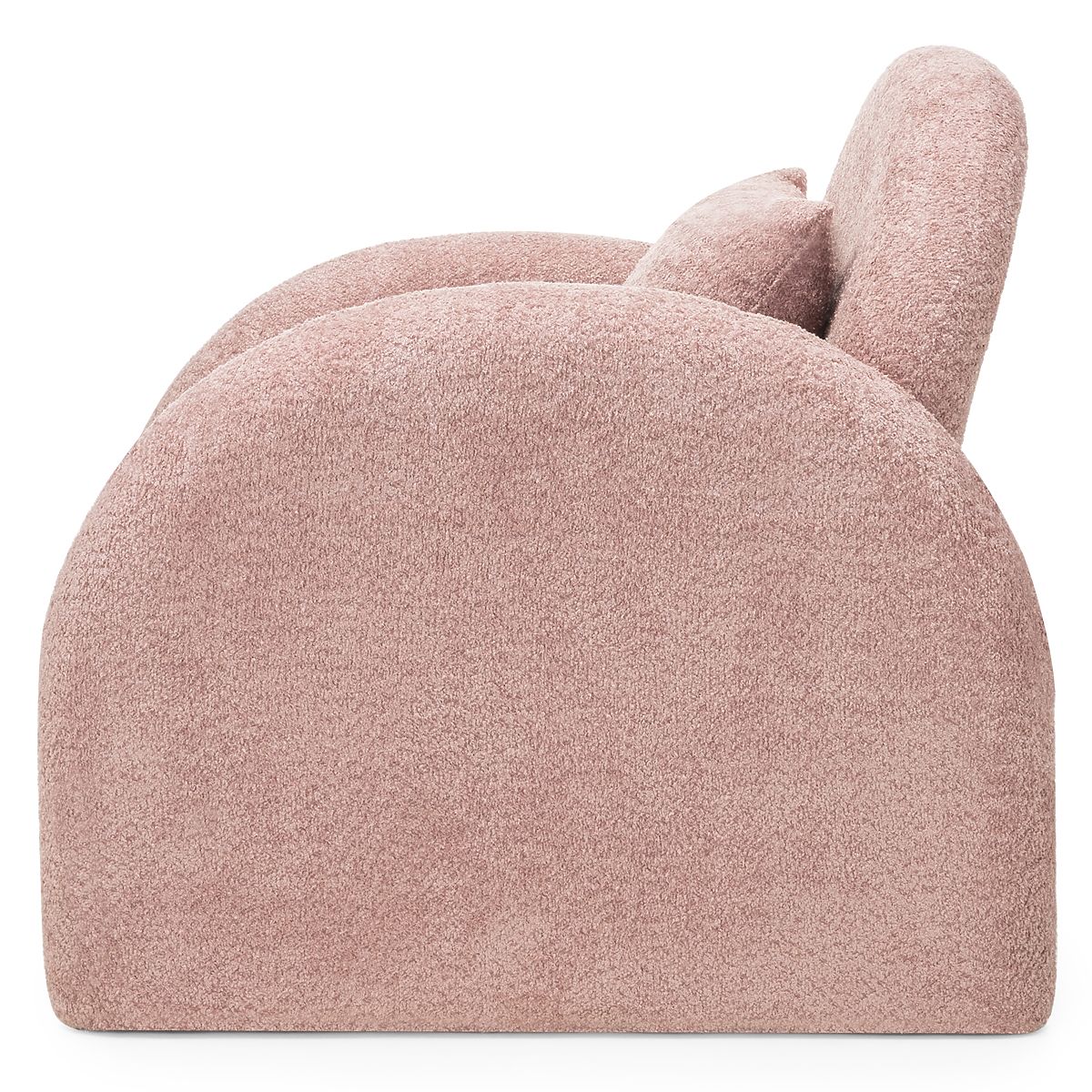 Lekerekített formájú, rózsaszín boucle szövet relaxációs fotel. .. többet