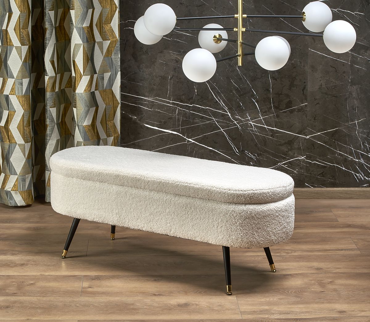 Tárolóval ellátott krémszínű pad bouclé szövetből. .. többet