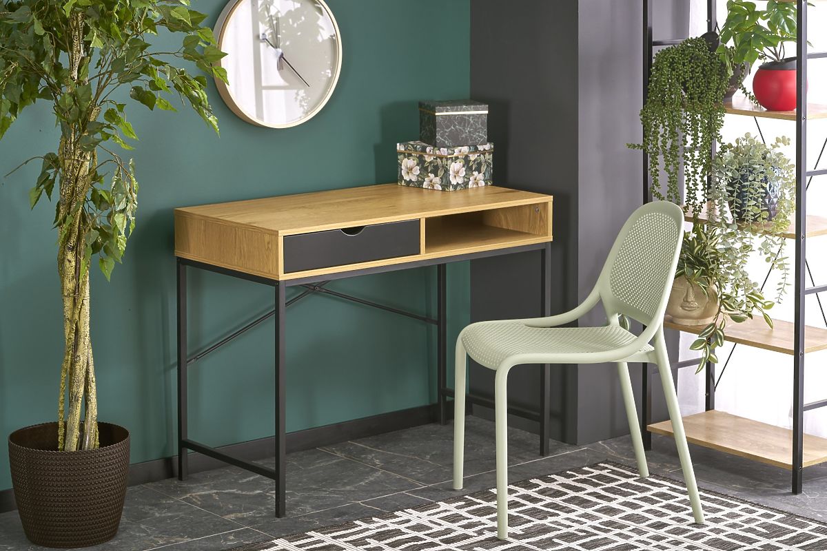 B-50 íróasztal ideális választás iskolásoknak, diákoknak és otthoni dolgozósarokhoz. Egyszerű, de modern dizájnjának köszönhetően arany tölgy dekorral és fekete fém lábakkal könnyen illeszkedik bármilyen belső térbe – a diákszobától az otthoni irodáig. Az asztal praktikus tárolási megoldást kínál egy fiók és nyitott polc formájában, ahová füzeteket, könyveket, irodaszereket vagy kisebb elektronikai eszközöket helyezhet el. A munkafelület elegendően nagy a laptop, lámpa és egyéb szükségletek számára. Az asztal gyártásához használt laminált anyag karc-, horpadás- és szennyeződésálló, ami biztosítja a hosszú élettartamot és könnyű karbantartást.