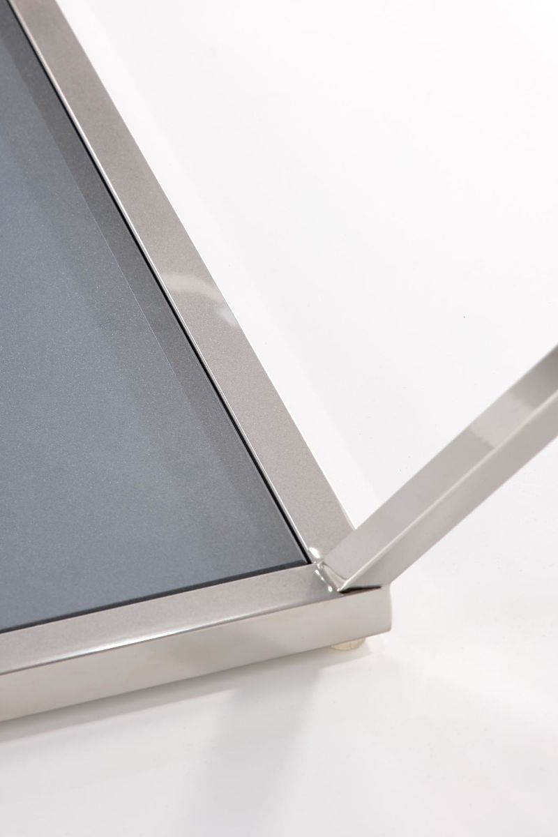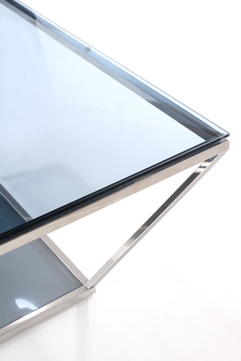 Füstszínű dohányzóasztal üvegből és rozsdamentes acélból. .. többet