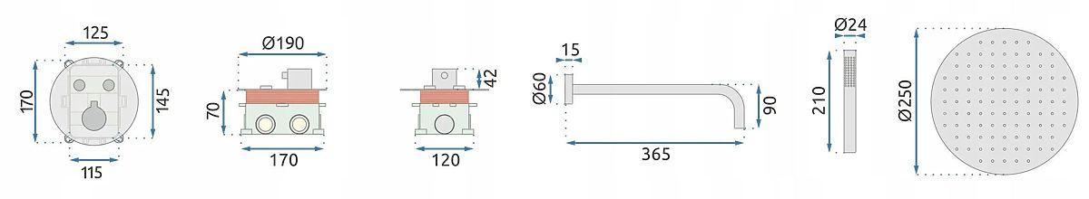 Beépített zuhanykészlet termosztáttal LUNGO Kefe réz + BOX