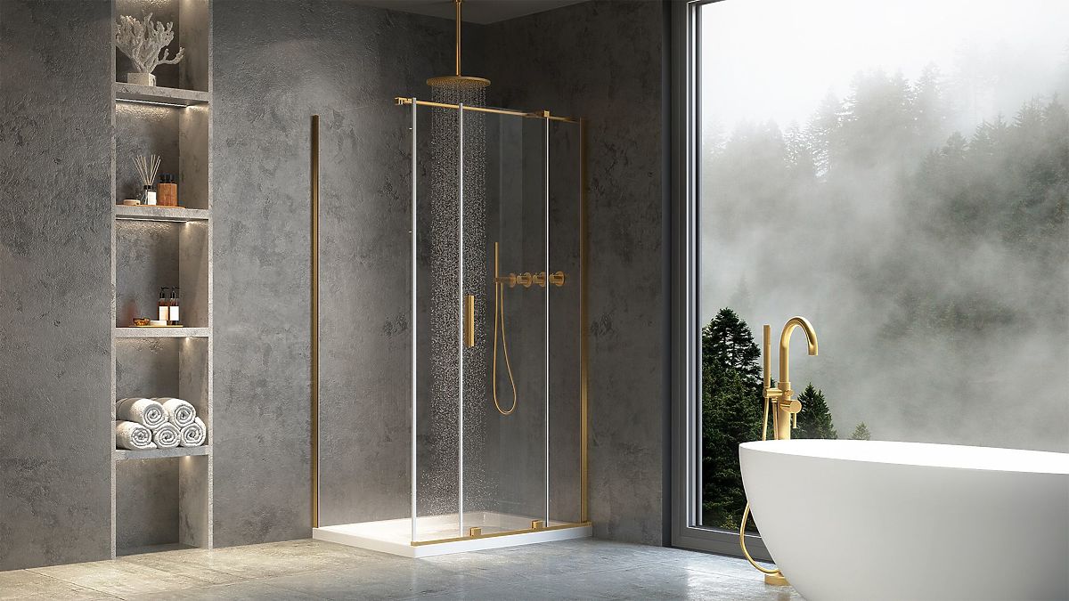 Zuhanykabin tolóajtókkal és kefélt arany felülettel. .. többet