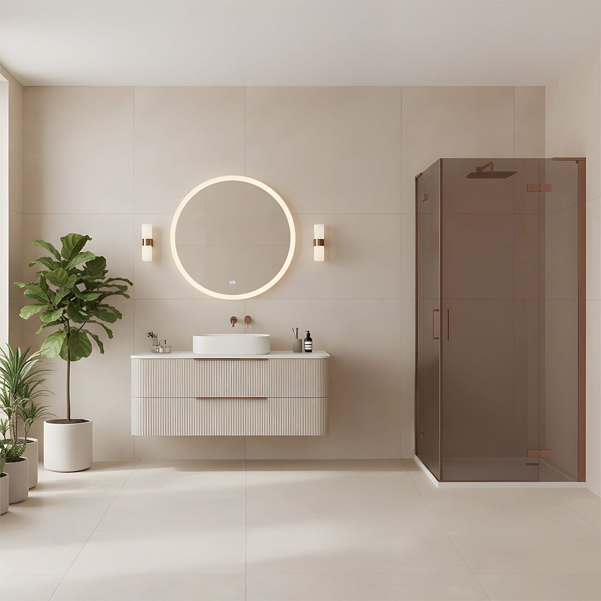 A Hugo Double zuhanykabin modern megoldás, amely az eleganciát és a funkcionalitást ötvözi. Edzett, füstös barna üvegből készült, kefélt réz színű profilokkal kiegészítve, ami minden fürdőszoba kivételes elemévé teszi, kiemelve annak luxus jellegét.