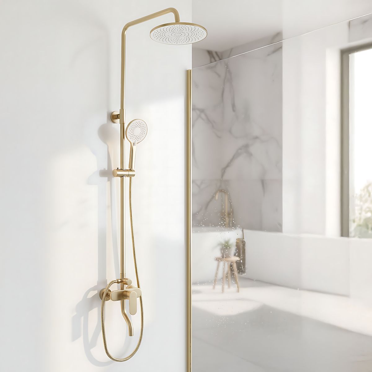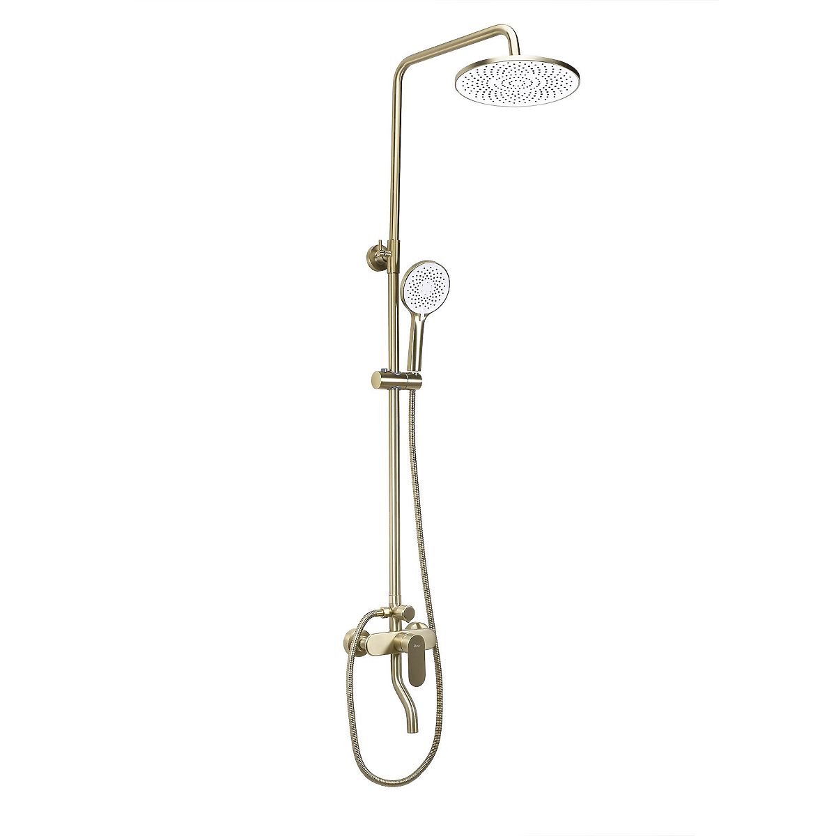 Az elegáns kefézett arany színű zuhanykészlet modern és funkcionális megoldás, amely kiemeli fürdőszobája egyedi karakterét. A minimalista dizájn luxus kivitelezéssel párosulva biztosítja, hogy a készlet remekül illeszkedik mind a glamour elrendezésekhez, mind a modern belső terekhez.