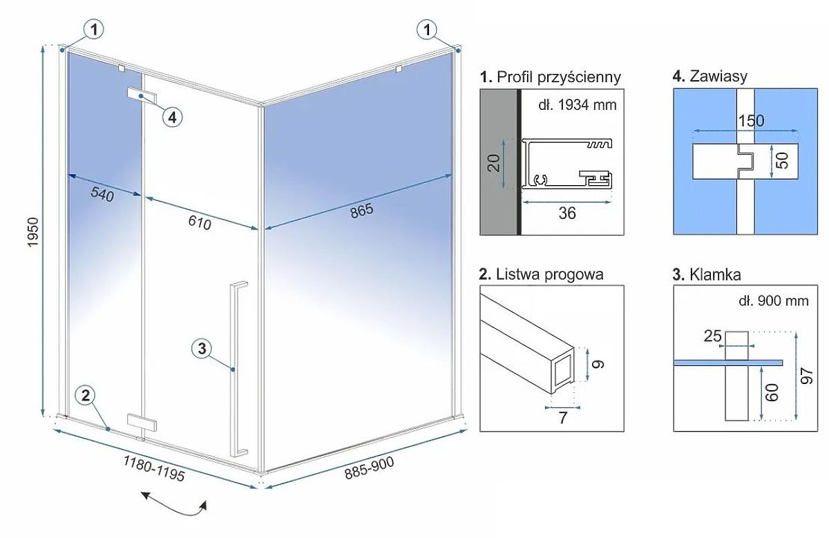 A kabin univerzális profillal rendelkezik, jobb vagy bal oldalra is felszerelhető. Konstrukciójának köszönhetően a Fargo kabin különböző magasságú tálcára vagy közvetlenül a padlóra is felszerelhető. A csomag tartalmazza a kabin felszereléséhez szükséges összes elemet: tömítések, tartó, zsanérok.