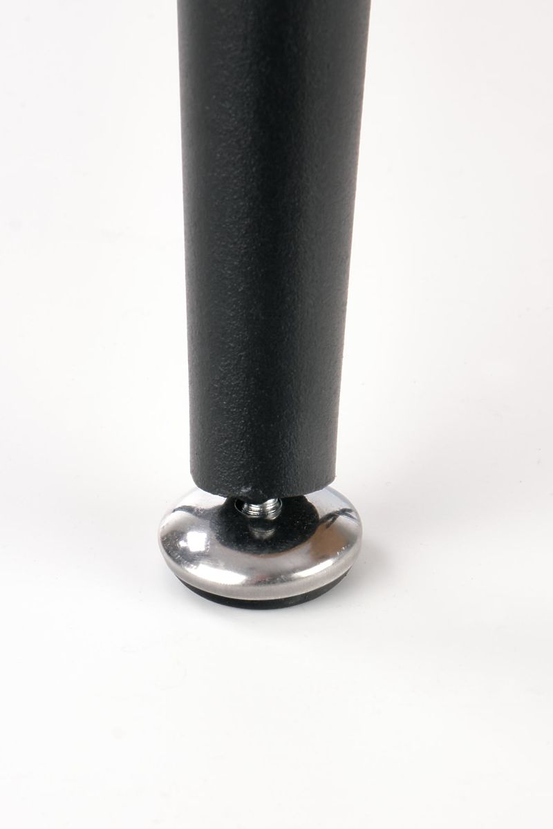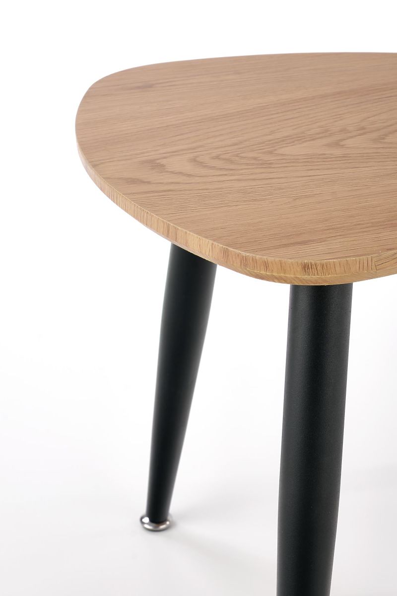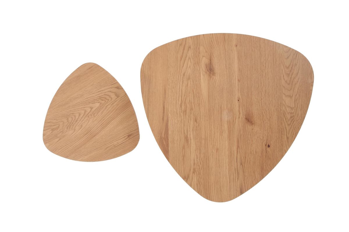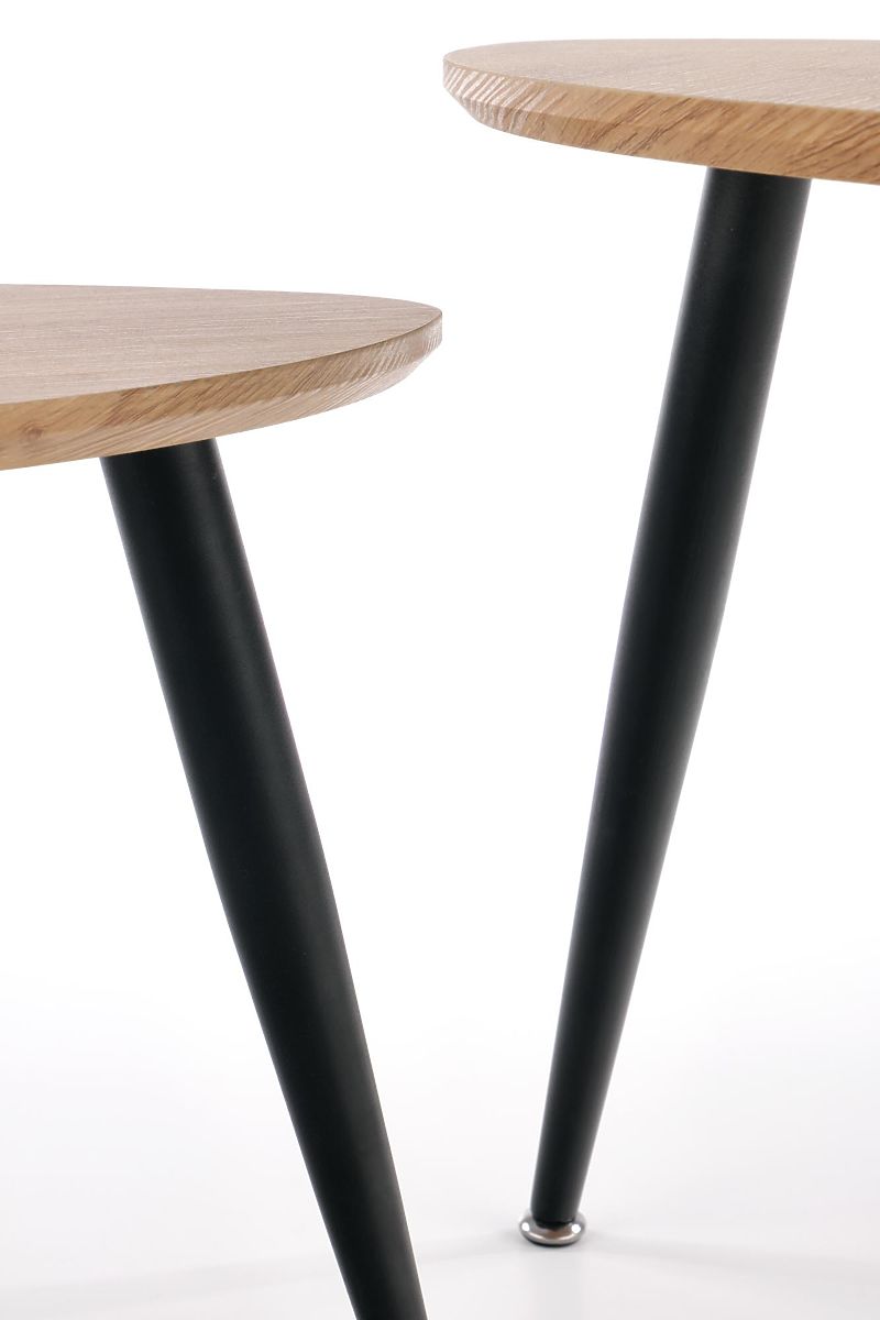 A stabilitást három acél láb biztosítja fekete porszórt bevonattal, amelyek lefelé enyhén keskenyednek, könnyed és modern megjelenést kölcsönözve az asztaloknak. Az ovális, furnérozott MDF lapok látható természetes mintázattal kiemelik az egész összeállítás időtlen jellegét.
