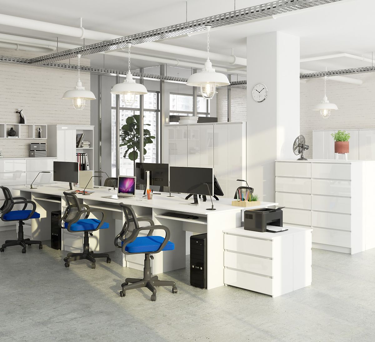 Szabadon álló fehér íróasztal laminált lapból, akril magasfényű előlapokkal. .. többet