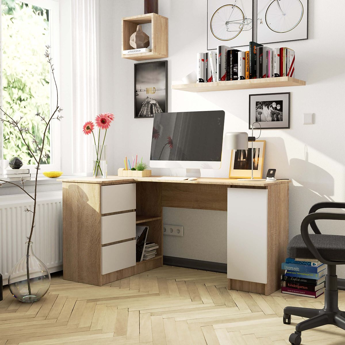Gyönyörű és funkcionális sarok számítógépasztal szekrénnyel és fiókokkal, amely modern bútor a vásárlóink által kedvelt színkombinációban. Az univerzális fehér és a nagyon praktikus sonoma tölgy kombinációja kiváló választás azok számára, akik követik a jelenlegi trendeket, és hatékony, funkcionális munkaterületet szeretnének kialakítani. A sarokasztal tökéletesen kihasználja a teret, miközben teljes kényelmet biztosít a munkához. Hosszú asztallappal és számos szekrénnyel, valamint fiókkal van felszerelve, amelyekben tárolhatók a munkahelyen szükséges apróságok. A bútor 16 mm vastag laminált lapból készült, amely magas kopásállóságot mutat. A látható élek ABS szegéllyel vannak ellátva, amely fokozott ellenállást biztosít a sérülésekkel szemben. Az asztal méretei 155 cm x 77 cm x 85 cm. A sonoma tölgy sarokasztal a szilárd szerkezet, a modern design és a funkcionalitás kombinációja minden részletében, amely vonzó áron elérhető.