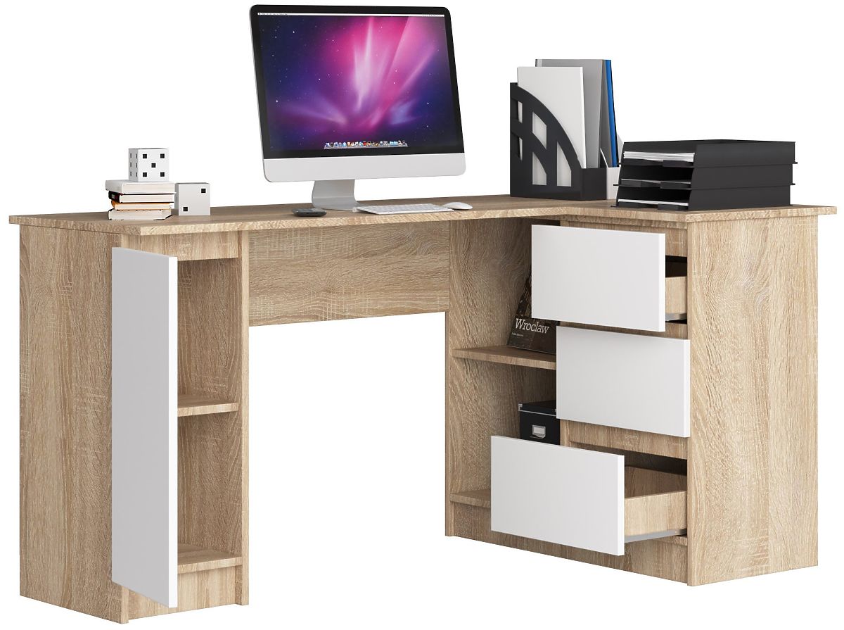 Sarok íróasztal Sonoma tölgy és fehér színben, praktikus fiókokkal. .. többet
