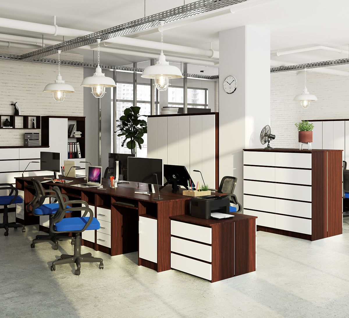 Az ANA íróasztal a klasszikus színek eleganciáját – wenge és fehér – egyszerű, funkcionális formával ötvözi. Konstrukciója sok helyet kínál: két nyitott polc, három fiók és egy polcos szekrény. Ezenkívül a nagy munkafelület lehetővé teszi a monitor és a dokumentumok szabad elrendezését. A kihúzható billentyűzettartó polc jelentősen növeli a számítógépes munka kényelmét. Az ANA asztal erős, kopásálló laminált lapból készült, amelyet a bútor hátoldalán is használtak, lehetővé téve bármilyen elrendezésben és helyiségben való elhelyezését. Irodába, dolgozószobába vagy tinédzser szobájába ideális.