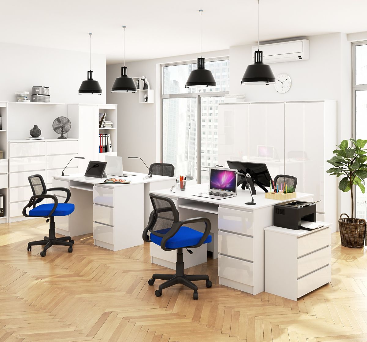 Az egyszerű, mégis elegáns fehér asztal időtlen és univerzális választás, amely irodában és lakótérben egyaránt megállja a helyét. Különösen alkalmas otthoni dolgozószobába, gyerekszobába vagy diákszobába, ahol kényelmes és esztétikus helyet biztosít a munkához vagy tanuláshoz. A bútor praktikus, kihúzható billentyűzettartó polccal és hat tágas fiókkal van felszerelve, amelyek minden szükséges irodai kelléket elnyelnek.