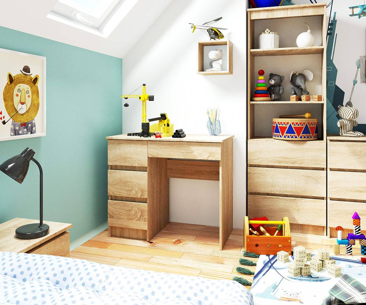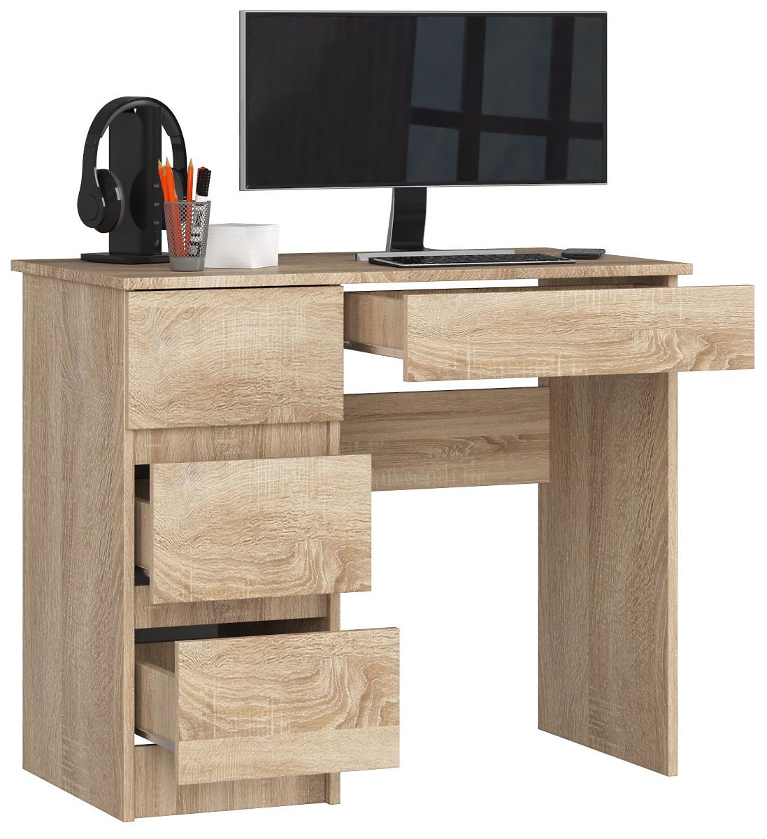 Balos számítógépasztal sonoma tölgy színben, négy tágas fiókkal. Tökéletesen illik gyerekszobába, diákszobába, de irodába vagy dolgozószobába is. Az asztal a CLP bútorcsalád része, úgy tervezték, hogy illeszkedjen a sorozat többi bútorához. Ennek köszönhetően különféle bútorokkal, mint például polcokkal vagy komódokkal rendezheti be a szobát, amelyek formailag és színben is passzolnak. Modern vonalvezetésű, fogantyú nélküli fiókokkal, amelyek minimalista bájt kölcsönöznek a bútornak. Sok tárolóhelyet kínál, mivel négy fiókkal rendelkezik. Klasszikus megjelenésének köszönhetően az asztal univerzális karakterrel bír, és sosem megy ki a divatból. Az asztal kialakítása kényelmes és ergonomikus számítógép-használatot tesz lehetővé.