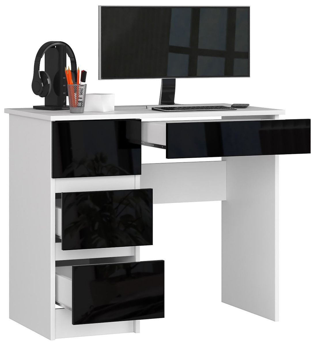 Az A-7 számítógépasztal kiváló minőségű, kopásálló laminált lapból készült. A fehér szín fekete, fényes szekrényfrontokkal van kombinálva. Ideális azok számára, akik értékelik a minimalizmust, az egyszerűséget és a bútorok eleganciáját. Az asztal nagyon stabil, és nagy gondossággal, minden részletre odafigyelve készült. Kiválóan illik irodába, diákszobába vagy nappaliba. Alkalmas munkára és távoktatásra egyaránt.