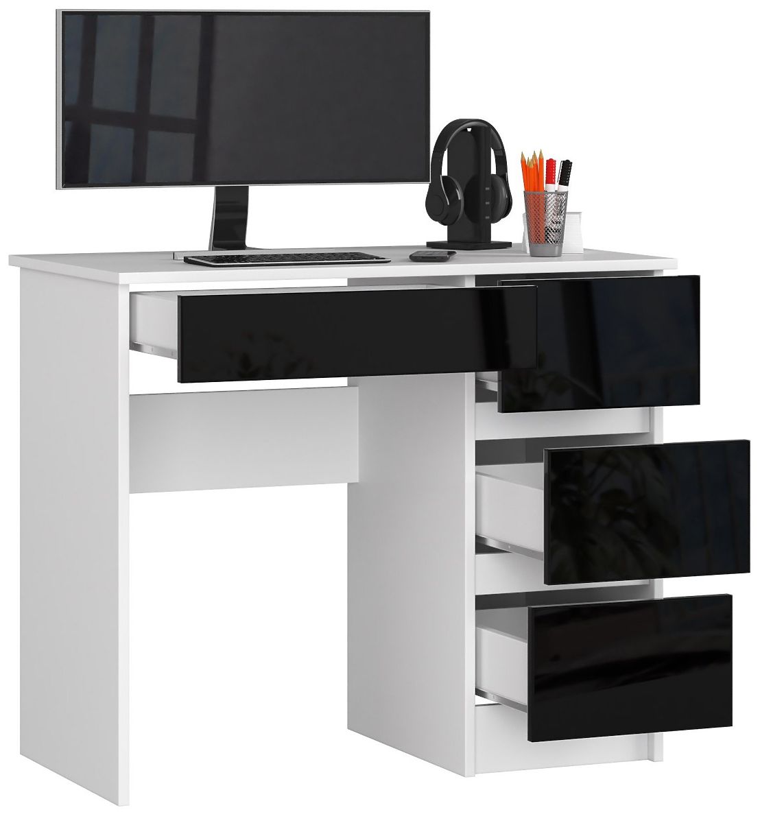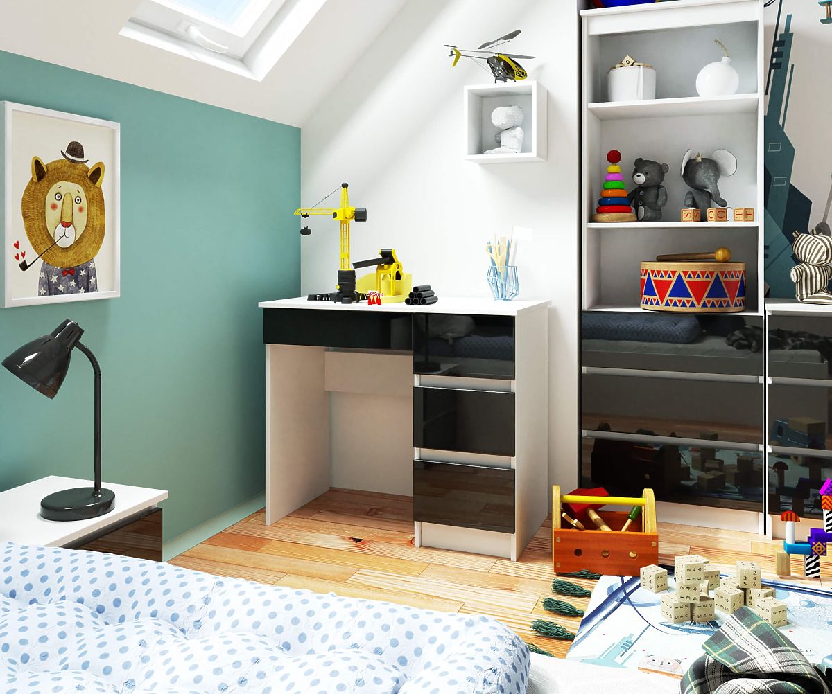 A fekete és fehér két időtlen szín, amelyek nemcsak egymáshoz, hanem bármilyen más színhez is remekül illenek. Éppen ezért évek óta használják őket számos belsőépítészeti elrendezésben. Különösen jól illenek ifjúsági szobákba. A bemutatott A-7 90 cm (jobbos) modell egy kis méretű asztal, amely fehér testet és fekete fényes elülső felületeket kombinál. Az érdekes kompozíció biztosan elnyeri a minimalizmus, az univerzális színek és az egyszerű formák kedvelőinek tetszését.
