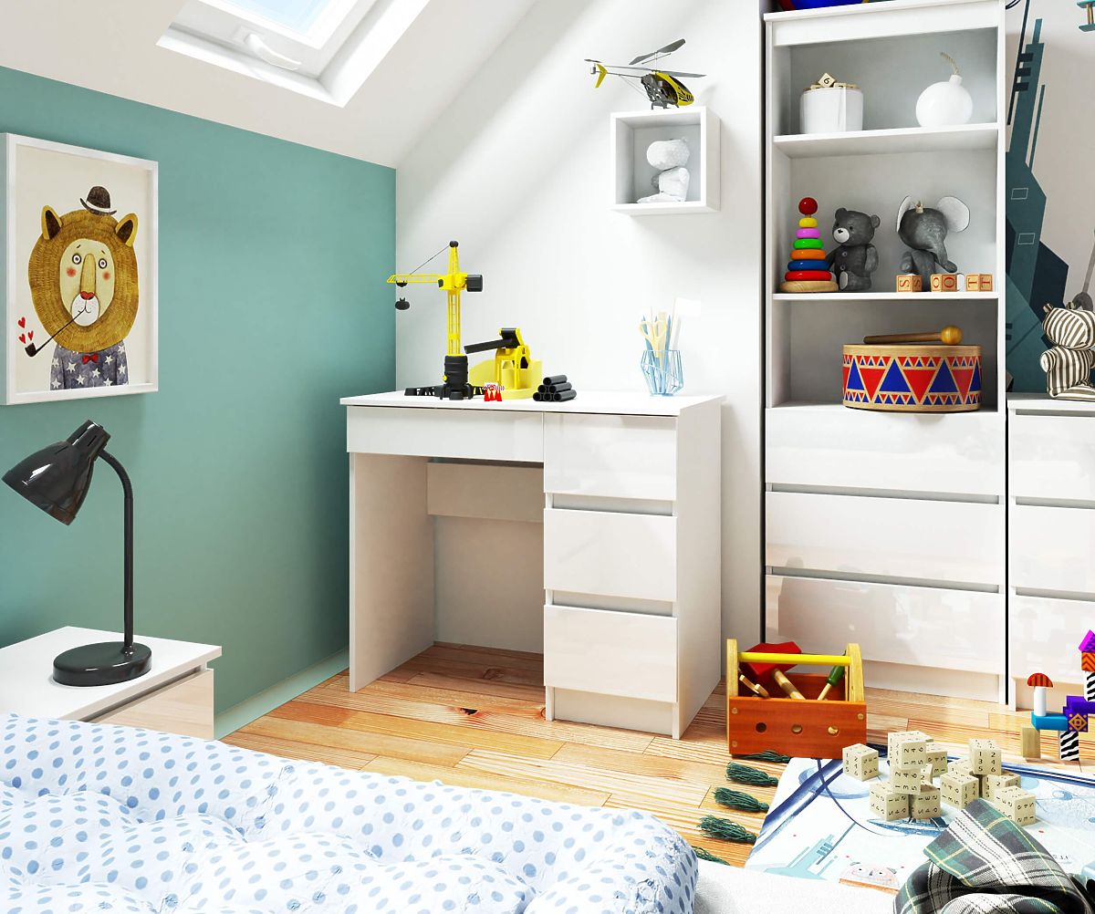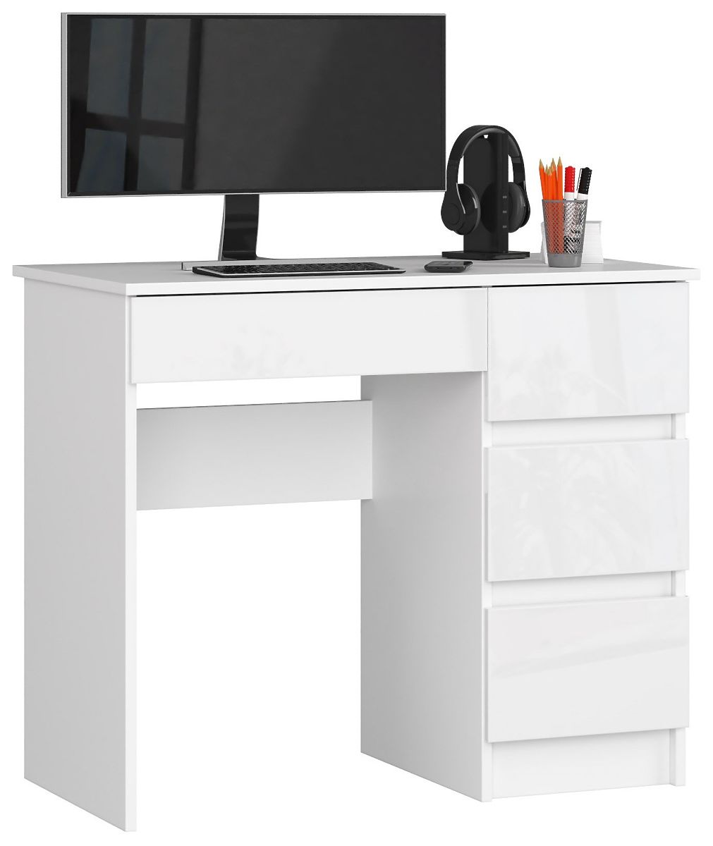 A fehér korpusz és a fehér fényes előlapok kombinációja olyan hatást kelt, amely biztosan meggyőzi azokat, akik a minimalizmust, a skandináv vagy modern stílust részesítik előnyben. A bemutatott ajánlat könnyű használatot és tágas fiókokat kínál, amelyek sok szükséges irodai kelléket elnyelnek. Gondosan elkészített bútor, mint például a 90 cm-es jobb oldali A-7 számítógépasztal, szabadon kombinálható a kollekció más elemeivel.