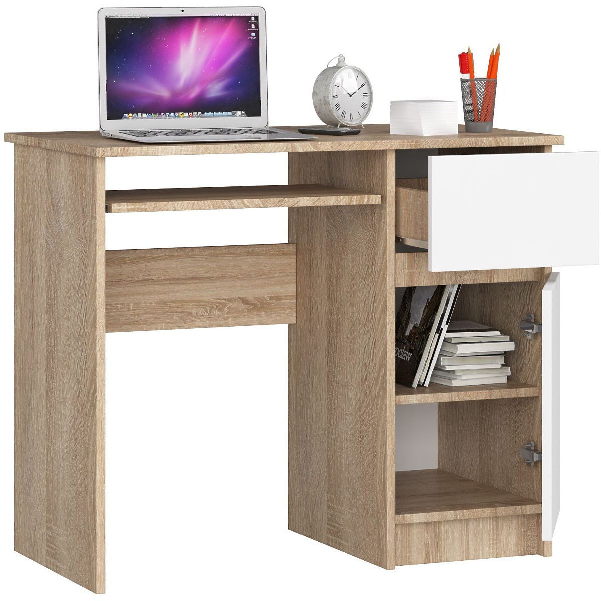 A PIKSEL 90 cm-es számítógépasztal sonoma és fehér színekben kiválóan mutat a kis belső terekben. Világos színei felderítik a helyiséget, és könnyen alkalmazkodnak a szoba többi színéhez. A PIKSEL asztal iskolai asztalként is szolgálhat. A kényelmes számítógépes munkát a kihúzható billentyűzettartó biztosítja. Az oldalsó fiók és a polcos tágas szekrény révén a PIKSEL asztal ideális tárolóhely is. A kihúzható billentyűzettartó és a fiók fém görgős síneken mozognak. Az asztal felülete kellemes tapintású és kopásálló a speciális laminált lap használatának köszönhetően. A fehér frontok sima felülete elegáns karaktert kölcsönöz az egésznek.