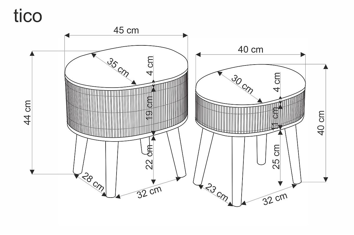 Két puffból álló készletTICO elegáns és praktikus megoldást kínál modern és otthonos hangulatú enteriőrök számára. Finom ovális formájának, természetes fa anyagának és bézs kárpitozásának köszönhetően harmonikus és időtálló megjelenést biztosít, így könnyedén stílusos kiegészítőjévé válhat a nappalinak, hálószobának vagy előszobának. A puffok kellemes tapintású anyaggal vannak kárpitozva bézs árnyalatban, amely melegséget és puhaságot kölcsönöz a térnek. A tömör kaucsukfa természetes kivitelű stabil szerkezete biztosítja a szilárdságot és a hosszú élettartamot. Mindegyik puff praktikus tárolóhellyel van felszerelve, amely ideális takarók, párnák, apróságok vagy otthoni kiegészítők tárolására. A különböző méreteknek köszönhetően a puffok önállóan is használhatók, vagy aktuális igények szerint kombinálhatók. Kiválóan szolgálhatnak kiegészítő ülőhelyként, lábtartóként vagy dekoratív elemként a belső térben. Szétszerelt állapotban szállítva a könnyű kezelhetőség érdekében.
