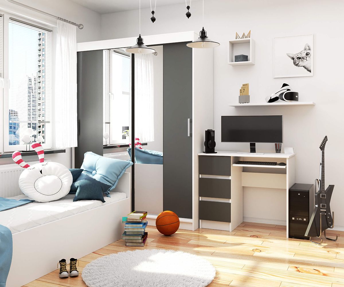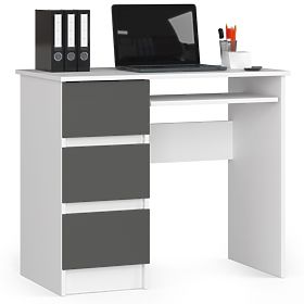 Az A-6 fehér/grafitszürke íróasztal kiválóan alkalmas gyerek- és diákszobába, de dolgozószobába is. Kis méretei lehetővé teszik a tanulás vagy távmunkavégzés helyének kialakítását hálószobában vagy nappaliban is. Az asztal ideális kis, hangulatos irodák számára is. A fehér, sima lap és a grafitszürke minta kombinációjának köszönhetően a bútor illeszkedik mind a modern, mind a klasszikusabb bútorokhoz.