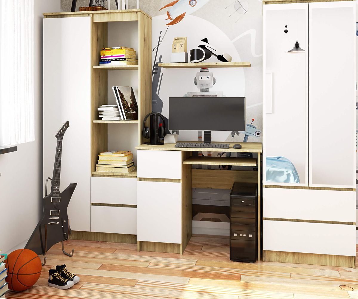 A PIKSEL artisan tölgy/fehér számítógépasztal kiválóan alkalmas gyermek- vagy diákszobába, valamint hálószobába vagy nappaliba, ahol otthoni munkához vagy tanuláshoz kijelölt sarok található. Kis irodai helyiségekben is alkalmazható, ahol tökéletesen illeszkedik a fogantyú nélküli rendszerű bútorokhoz.