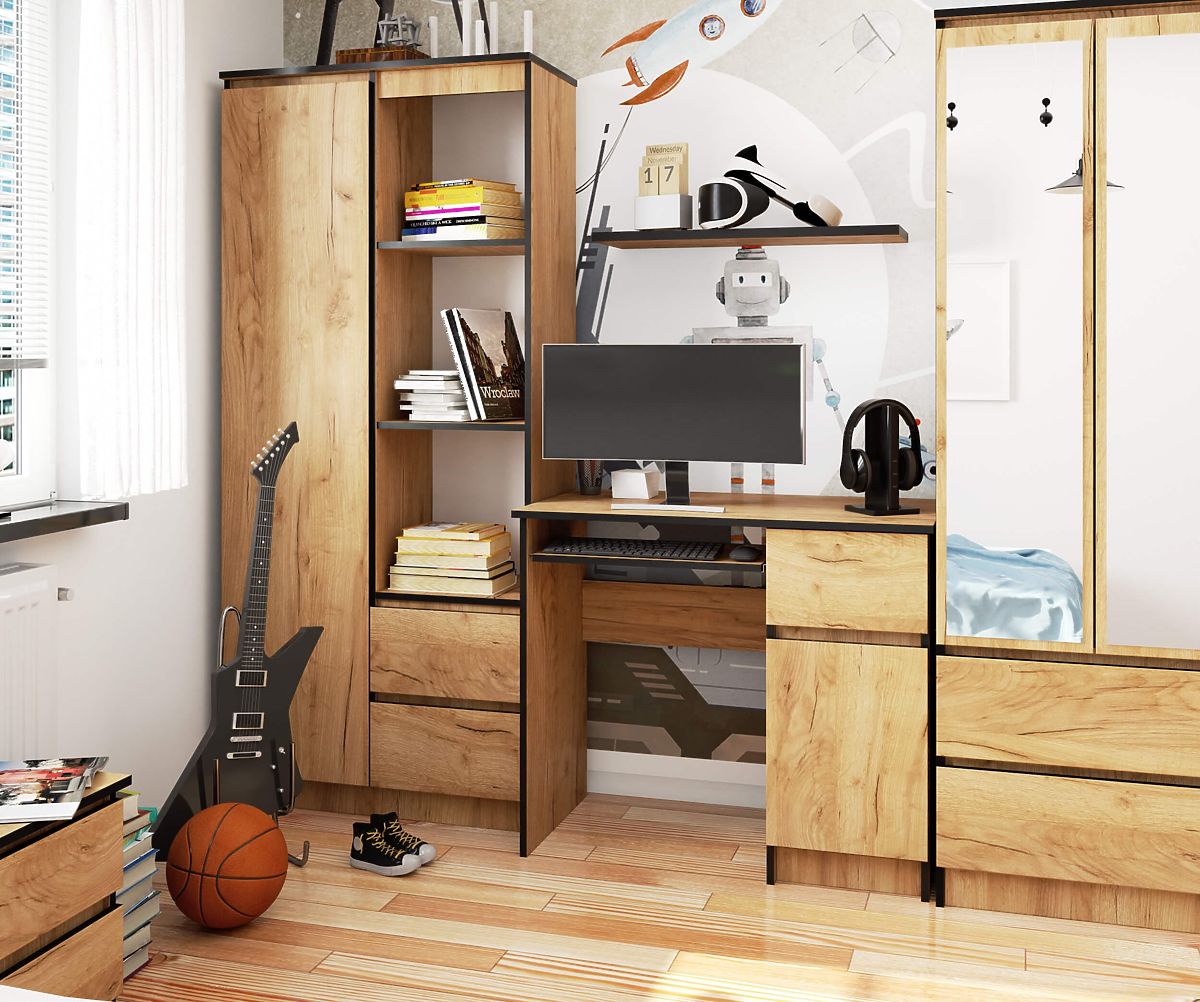 A PIKSEL 90 cm-es számítógépasztal craft tölgy színben ideálisan illeszkedik a kis belső terekbe. Kiválóan használható iskolai asztalként vagy szállodai szobában is. Bár kis méretű, praktikus oldalsó fiókkal és polcos szekrénnyel rendelkezik, ahol szabadon elférnek a füzetek, iratrendezők és könyvek. Az asztalra könnyedén elhelyezhető a számítógép monitorja, a billentyűzet pedig a kihúzható polcra helyezhető. A PIKSEL számítógépasztal kellemes tapintású és könnyen karbantartható laminált lapból készült, amely kopásálló. A sima felület elegáns karaktert kölcsönöz az egésznek.