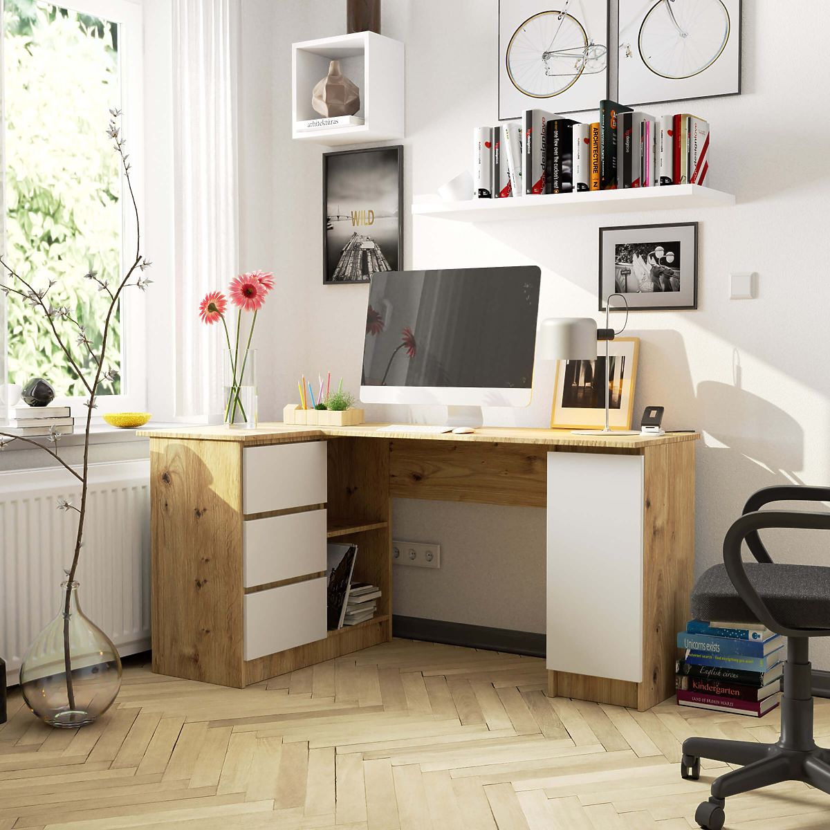 A B20 155 cm BAL OLDALI sarok íróasztal Artisan Tölgy színben, fehér elülső felületekkel elegáns irodabútor modern dizájnnal. Kiváló választás otthoni irodákba és gyerekszobákba. A sarokasztal beilleszkedik a szoba elrendezésébe, és megfelelő teret biztosít munkához és tanuláshoz. A fiókoknak, polcoknak és szekrénynek köszönhetően, amelyek az asztal mindkét oldalán helyezkednek el, a szükséges tárgyak kéznél lesznek. Könnyen rendszerezhetjük a dokumentumokat, könyveket vagy irodaszereket, amelyeket a tágas, görgős síneken mozgó fiókok befogadnak. Az asztal 16 mm vastag, kopásálló Kronospan laminált lapból készült, amely hosszú élettartamot biztosít az asztalnak. A bútor élei ABS szegéllyel vannak ellátva, amely biztosítja az asztal mechanikai sérülésekkel szembeni ellenállását.