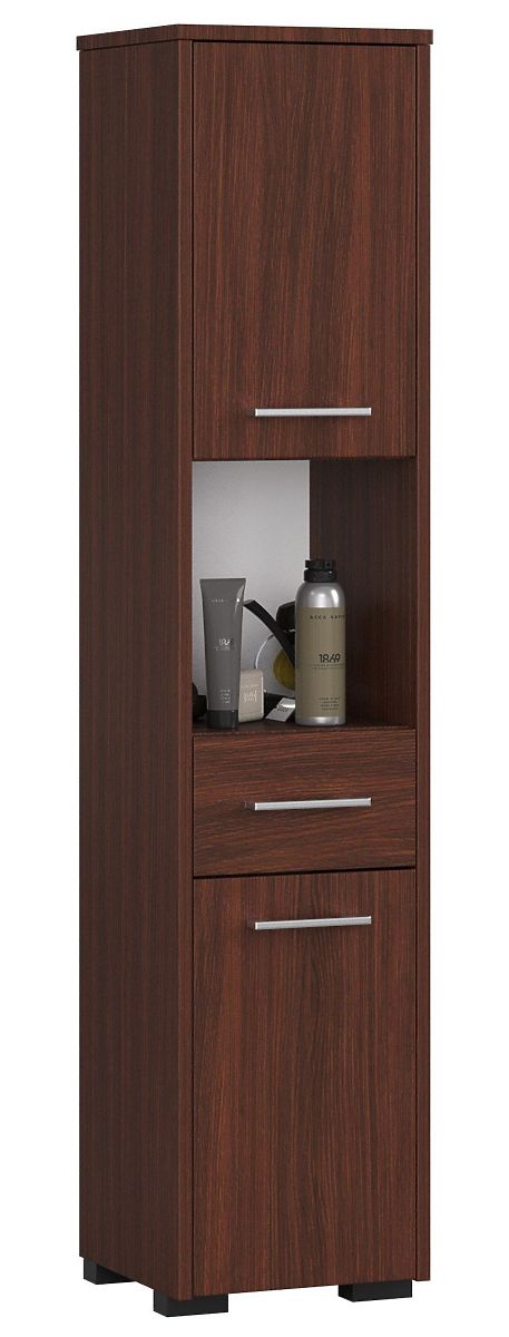 A fürdőszobai polc ideális bútordarab, amely segít kitölteni az üres helyet a fürdőszobában, miközben elrejti azokat a tárgyakat, amelyek ezt igénylik. A zsúfolt mosógépek, mosdók vagy tükrös polcok helyett esztétikus polcot kínálunk, amely nemcsak a legtöbb kozmetikumot tárolja, hanem elsősorban szépen is néz ki. Emellett lehetővé teszi a legszükségesebb dolgok kézközelben tartását. Beleférnek samponok, folyadékok és törölközők is. A fürdőszobai polc kopásálló laminált lapból készült. Ezenkívül, a tartós nedvesség jelenléte miatt, olyan anyagokból készült, amelyek védelmet nyújtanak a vízzel való érintkezés során bekövetkező deformáció ellen. A polc egy felső zárt polcból, egy középső nyitott részből, egy fiókból és egy alsó részből áll. Minden zárt elem fogantyúja stílusosan illeszkedik a bútor frontjainak színéhez. A fürdőszobai polc divatos wenge színben kapható.