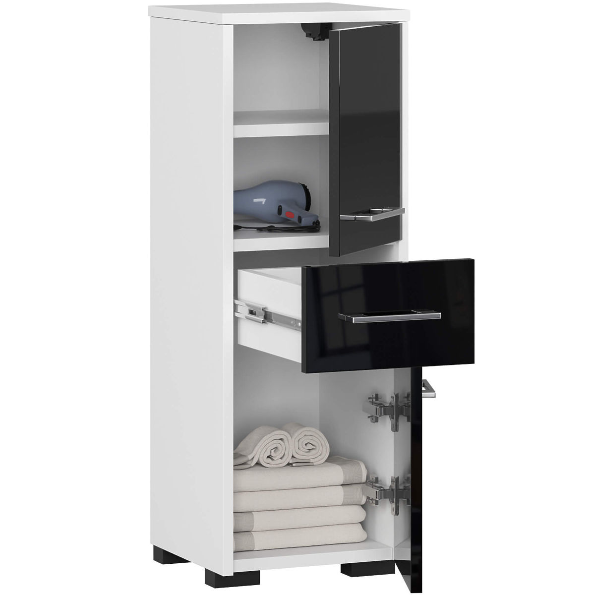 A szekrény-oszlop, FIN 2D 1SZ fürdőszobai polc (fehér/fekete fényes) kiváló választás a fürdőszobai terekhez. Olyan anyagokból készült, amelyek nem károsodnak a nedvesség hatására, ami biztosítja a bútor hosszú élettartamát, és elegánssá és nagyon praktikussá teszi a fürdőszobánkat.