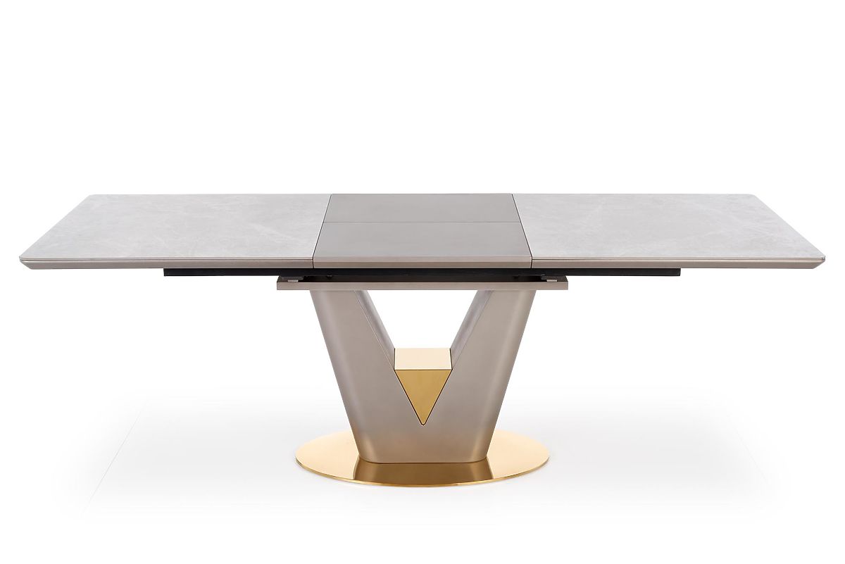 A VALENTINO kinyitható étkezőasztal a Halmar márkától a modern elegancia, luxus és funkcionalitás megtestesítője. Exkluzív dizájnjának köszönhetően a modern, glamour vagy reprezentatív stílusban berendezett étkezők vagy konyhák domináns eleme lesz. A téglalap alakú asztallap lekerekített sarkokkal és ferde élekkel kiváló minőségű MDF lapból készült, amelyet világosszürke márvány furnér borít, ami az asztalnak kifinomult és időtálló megjelenést kölcsönöz. Praktikus előnye a kinyitható mechanizmus, amely lehetővé teszi az asztal könnyű meghosszabbítását – kinyitás után a felületet két szürke árnyalatú lakkozott kerámia lap egészíti ki. Az asztal így kényelmesen helyet biztosít akár 8 személy számára. A stabilitást a masszív V alakú acél lábazat biztosítja, amelyet az alsó részen arany ék díszít. Az arany akcentusok az asztal ovális alapzatán is megjelennek, és a szürke kivitelű részekkel együtt luxus és harmonikus kontrasztot alkotnak. A VALENTINO asztal ideális választás azok számára, akik dizájnos, erős és praktikus étkezőasztalt keresnek, amely alkalmazkodik a mindennapi használathoz és ünnepi alkalmakhoz is.