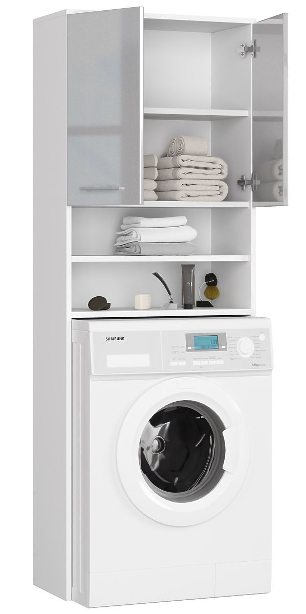 Mosógép fölé helyezhető fehér, metálikus fényű fürdőszobai polc. .. többet