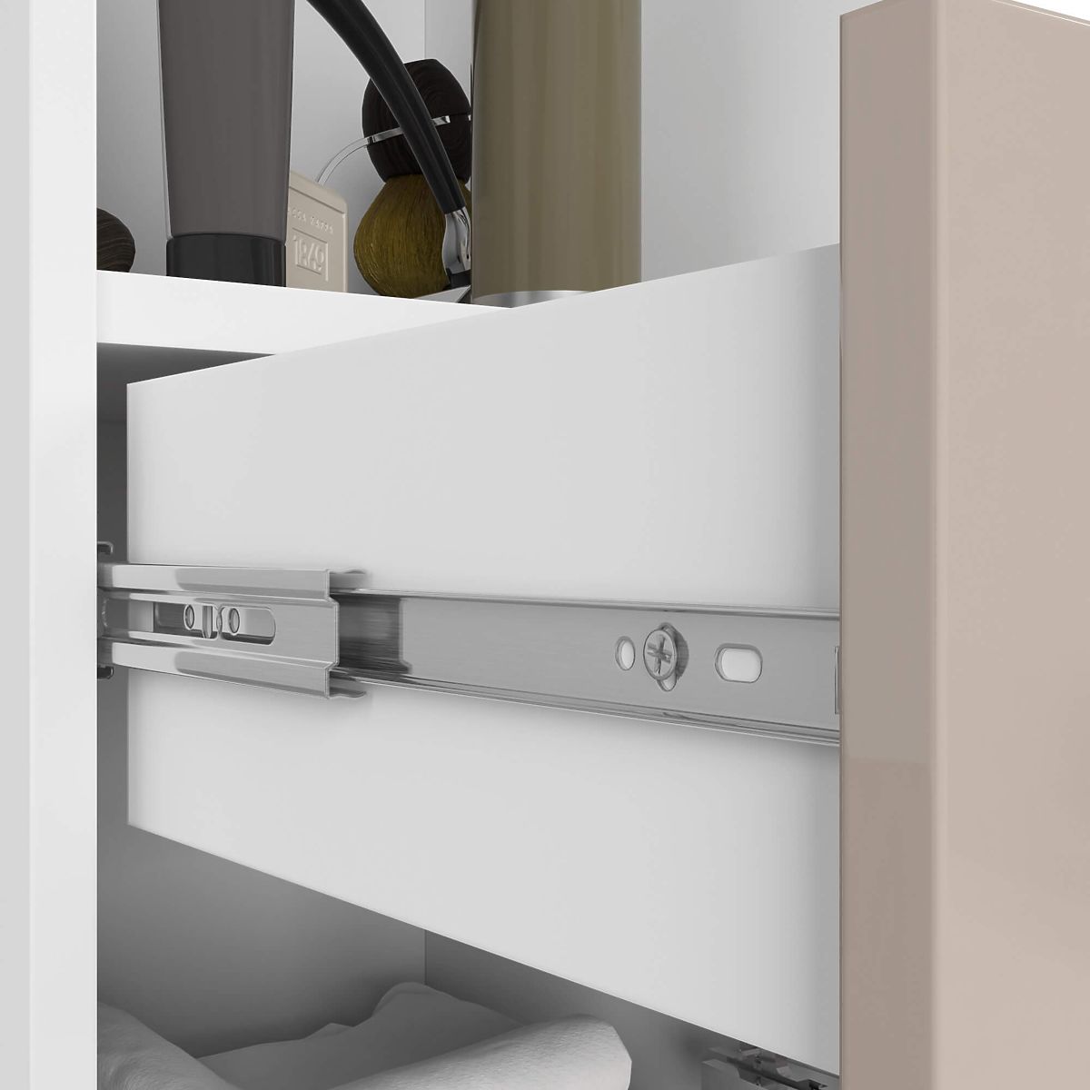 A polcok nagyon funkcionális bútorok, amelyek különböző helyiségekben használhatók. Sikeresen elhelyezhetők a fürdőszobában. A FIN 2D 1SZ 1W fürdőszobai polc oszlop elemei a Kronospan cég 16 mm-es kiváló minőségű laminált lapjából készültek, míg az éleken ABS élzárás található. Ennek köszönhetően a szekrény rendkívül ellenálló a nedvességgel, kopással és mechanikai sérülésekkel szemben. A polc alsó és felső részén ajtóval zárható szekrény található, amely polccal van elválasztva. Ezekben törölközők, ágyneműk vagy vegyszerek tárolhatók. Az oszlop középső részét egy kihúzható fiók foglalja el. Ideális hely kozmetikai apróságok számára. A fiók felett egy tágas nyitott tér található, amely nagyobb méretű kozmetikumok tárolására használható. A polc ajtajait ezüst fogantyúk díszítik.