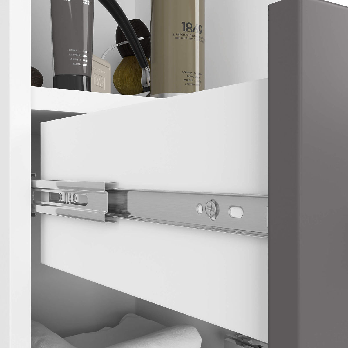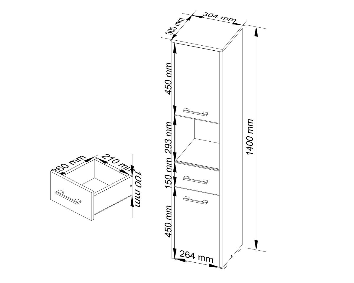 A fürdőszobai szekrény a legjobb minőségű, 16 mm vastag laminált lapból készült. Az oszlop védelme érdekében az élek ABS élzárással vannak ellátva. A fürdőszobai polcos oszlop divatos fehér/grafit szürke színben kapható. A szekrény ajtóinak fogantyúi univerzális ezüst színűek. Érdemes megemlíteni, hogy ennek a szekrénynek az összeszerelése nagyon egyszerű, és az útmutató a csomagolásban található.