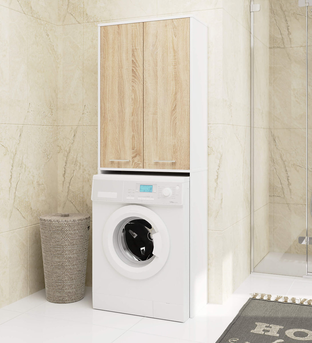 Ha azt szeretnénk, hogy fürdőszobánk kényelmes és stílusos legyen, érdemes szilárd és funkcionális bútorokra összpontosítani. Ilyen biztosan a mosógép fölé helyezhető szekrény. Ez az ideális módja a mosógép fölötti tér kihasználásának, amely általában kihasználatlan marad. Ennek az oszlopnak az optimális méretei kiváló megoldást jelentenek a kis alapterületű fürdőszobák számára. Ergonomikus formája lehetővé teszi a használatát bármely helyiségben. Ez a bútor, amely mosógép fölötti magasítóból és felette lévő szekrényből áll, rengeteg tárolóhelyet biztosít különféle tárgyak számára. A szekrénybe tisztítószereket vagy higiéniai termékeket tárolhatunk. Ezek a polcok személyes kozmetikumok vagy törölközők tárolására szolgálnak. A fehér szín gyönyörű árnyalata a Sonoma tölgy homlokzattal elegáns megjelenést biztosít a fürdőszobának. A laminált lap, amelyből ez a szekrény készült, kiváló minőségű anyag. Biztosítja a bútor tartósságát és szilárdságát, valamint esztétikai megjelenésének megőrzését.