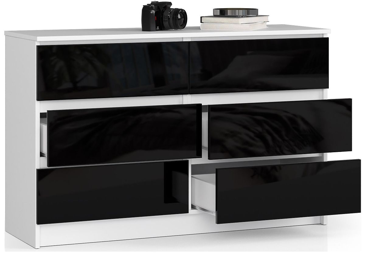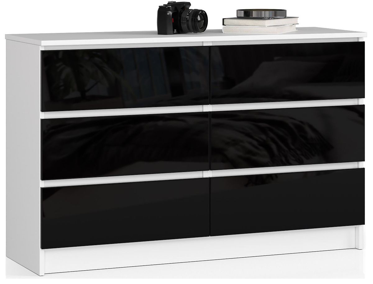 A K 120 cm-es modell első pillantásra felkelti az érdeklődést. Az időtlen elegáns fekete magas fényű felület fehér elülső felületekkel kombinálva nagyon hatásos stilisztikai egységet alkot. Ez a kombináció rendkívül elegáns és stílusos megjelenést biztosít. A bútor bizonyítja, hogy a klasszikus fehér és fekete soha nem megy ki a divatból.