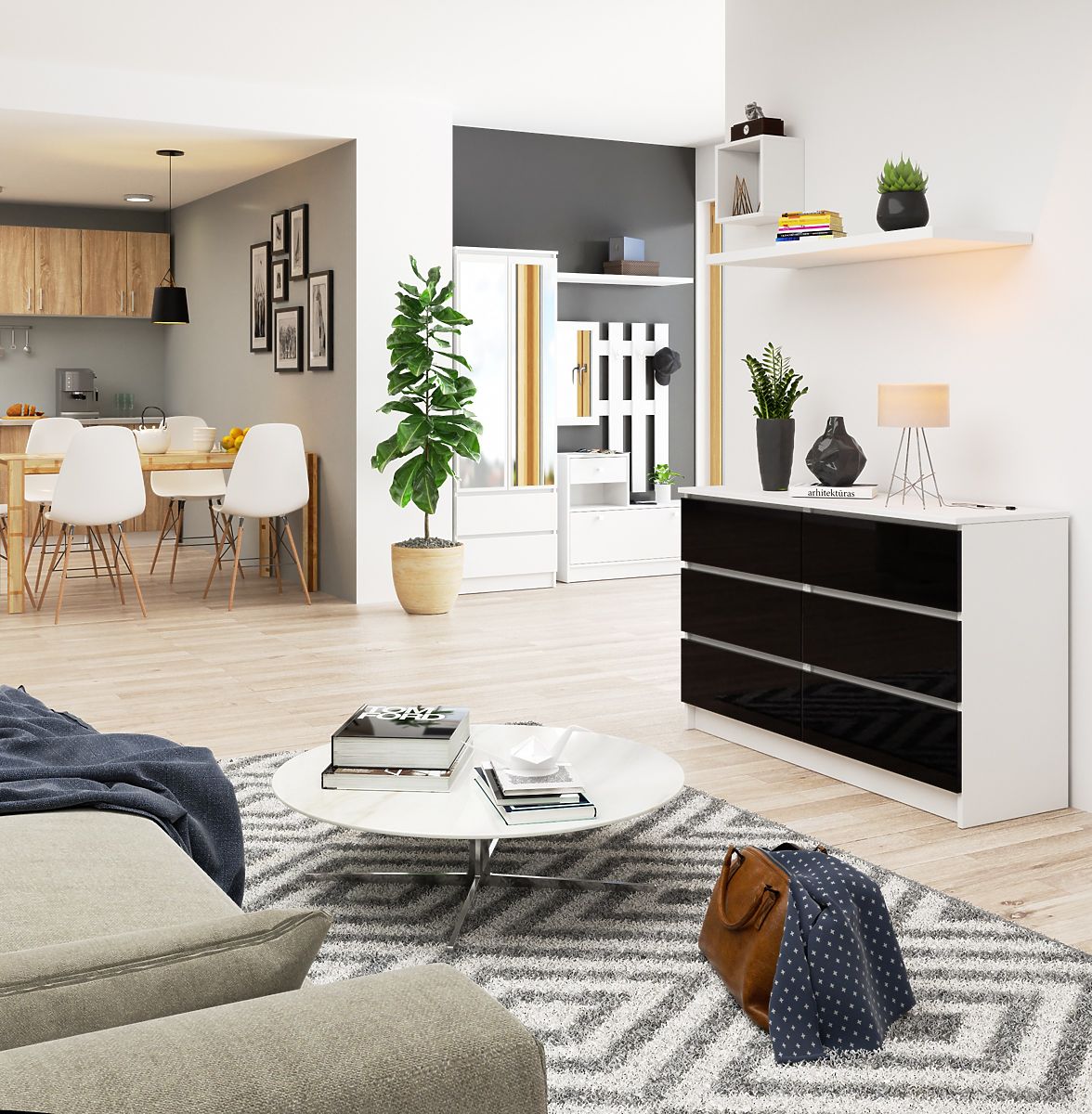Fekete magas fényű komód fehér elülső felületekkel. .. többet
