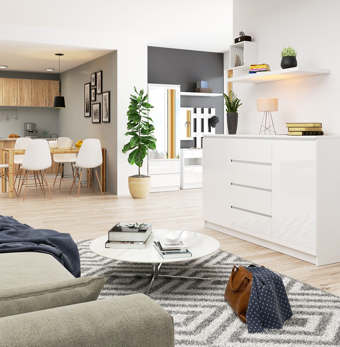 Mélység - 40 cm- A komód korpusa 16 mm-es fehér félmatt laminált lapból készült, amely ellenáll a kopásnak - Az előlapok 19 mm-es akril lapból készültek fehér magas fényű dekorral