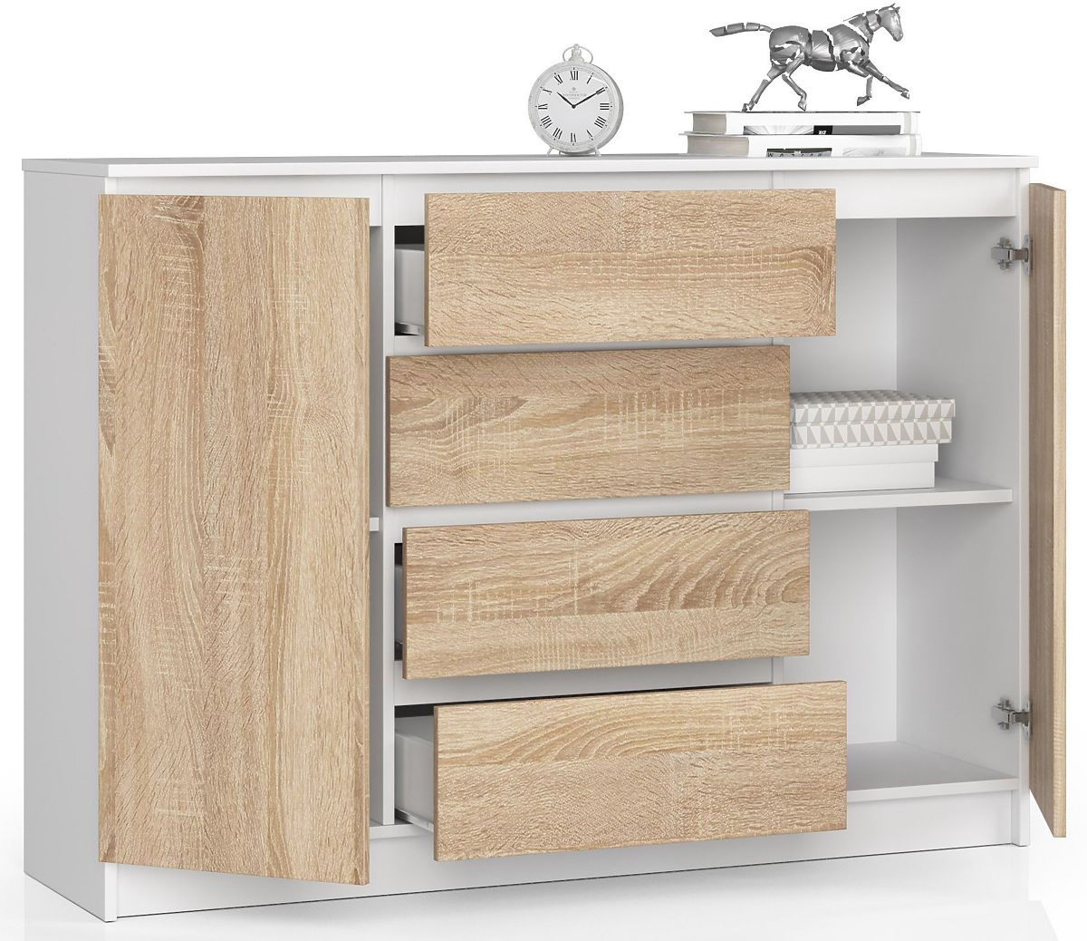 A K 140 komód 4 fiókkal a Kronospan tartós laminált lapjából készült. A K 140 korpusza fehér színű, míg a szekrények és fiókok frontjai sonoma tölgy színűek. A komód központi részét négy egymás fölött elhelyezett fiók alkotja, míg a komód mindkét oldalán külön ajtók találhatók. A fiókok fém görgős síneken csúsznak, nagy tárolóhelyet biztosítva. Az ajtók kinyitása után a felhasználó két szekrényt használhat, amelyek mindegyike két polccal van felszerelve.