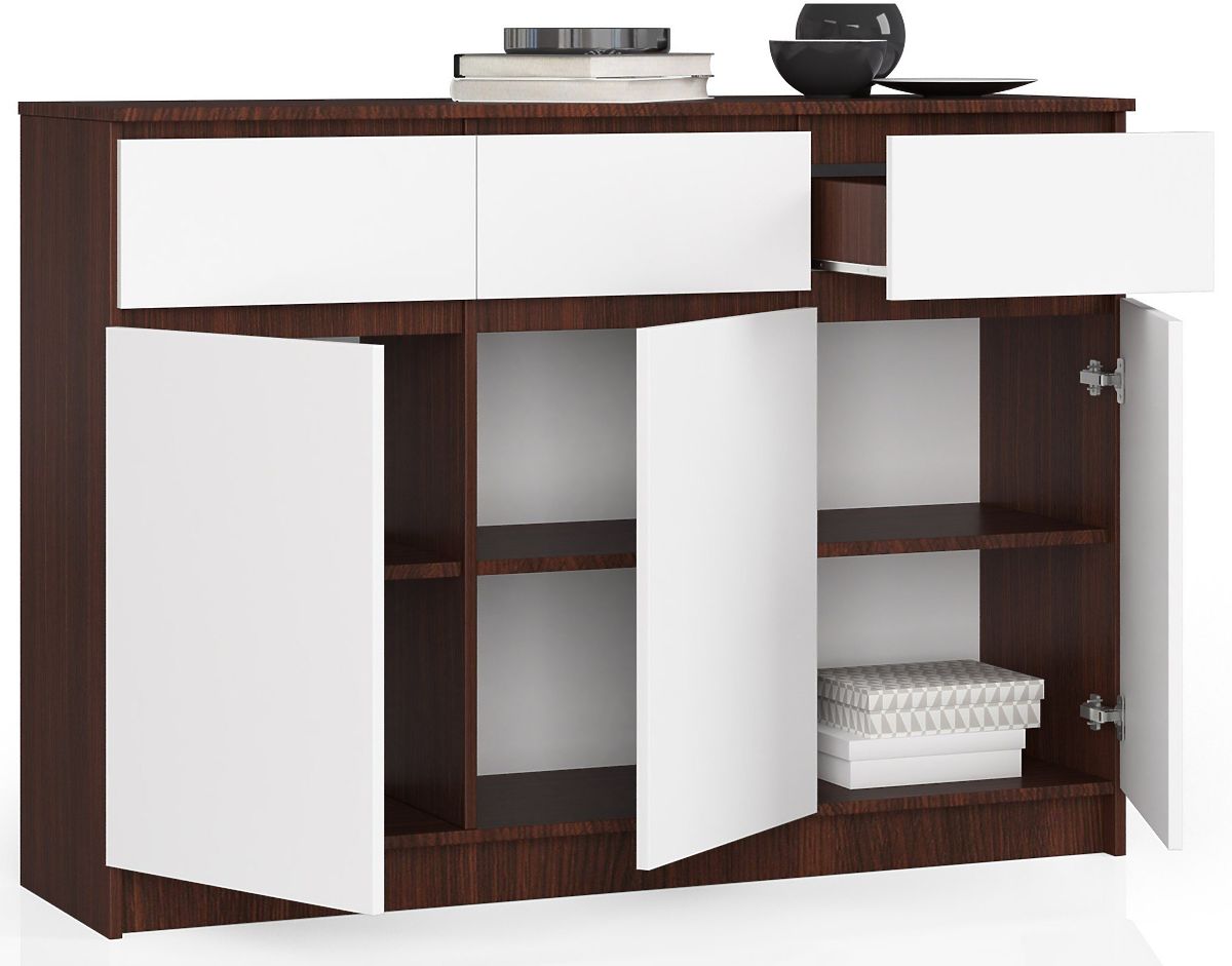 Tágas komód wenge és fehér színben, három fiókkal és szekrénnyel. .. többet