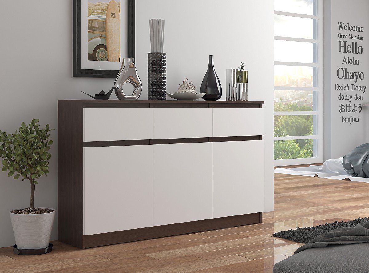 Nagy és stílusos komód sötét wenge színben, klasszikus, sima és fehér előlapokkal a szekrényeken és fiókokon. 16 mm vastag, tartós laminált lapból készült. A szekrény élei erős ABS éllel vannak borítva, amely ellenállóbb a karcolásokkal és mechanikai sérülésekkel szemben. Három funkcionális és tágas fiókkal, valamint három nagyon tágas szekrénnyel rendelkezik, amelyek mindegyikében egy polc található. A fiókok tartós fém síneken mozognak, szükség esetén könnyen kivehetők és alaposan tisztíthatók belül. Fogantyú nélküli előlapok a legmodernebb és divatos megoldás, nagy népszerűségnek örvendenek. A komód problémamentesen elnyeli az összes ruházatot és más háztartási szükségleteket, nagyon sok tárolóhelyet kínál és kényelmes a használata. Egyszerű dizájn és minimalista stílus teszi ezt a bútort univerzálissá, tökéletesen illeszkedik bármely belső térbe. Illik klasszikus, elegáns és modern stílushoz is. A komód ugyanolyan jól mutat a nappaliban, hálószobában vagy akár az előszobában is. Ezenkívül ez a komód modell kombinálható más, azonos színű bútorokkal, ami lehetővé teszi egyéni, összehangolt szett létrehozását. A nagy és tágas komódnak köszönhetően minden házban rend uralkodik, nem lesz hiány tárolóhelyből.