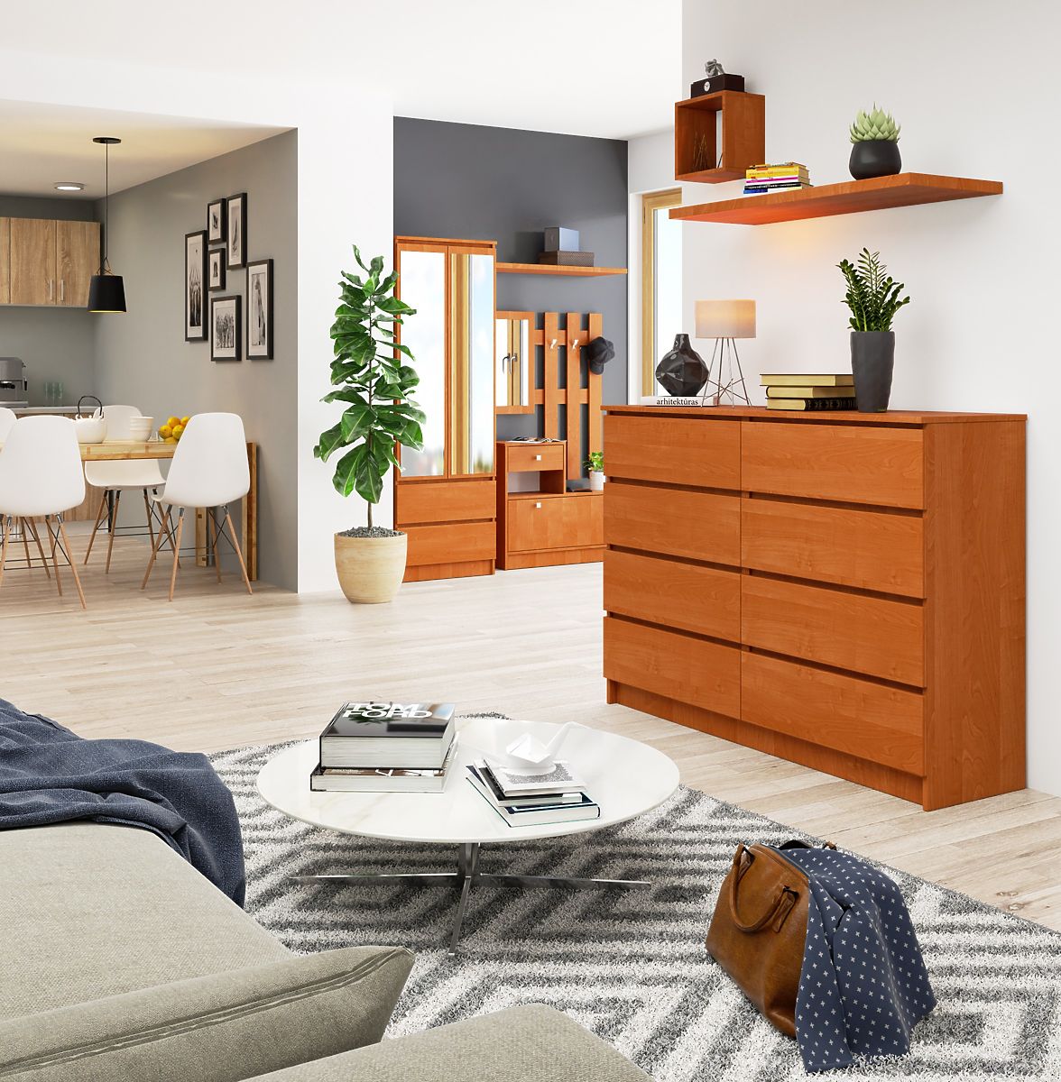 Az éger színű K140 komód a hagyományosan berendezett enteriőrök kedvelőinek készült. Az univerzális szín és a bútor egyszerű formái biztosítják, hogy jól illeszkedik olyan helyiségekbe, mint az irodák, szállodai szobák, de lakóterekbe is - nappalikba, hálószobákba, előszobákba vagy étkezőkbe. A komód jellegzetes tulajdonságai közé tartozik az időtálló dizájn, a szilárd szerkezet, a praktikus használat és a könnyű karbantartás. A nyolc tágas fiókkal felszerelt termék lehetővé teszi dokumentumok, ruhák és sok más szükséges tárgy tárolását az adott helyiségben. A bútor kedvező ára további előnye. Ajánljuk, hogy ismerkedjen meg a sorozat további elemeivel is.