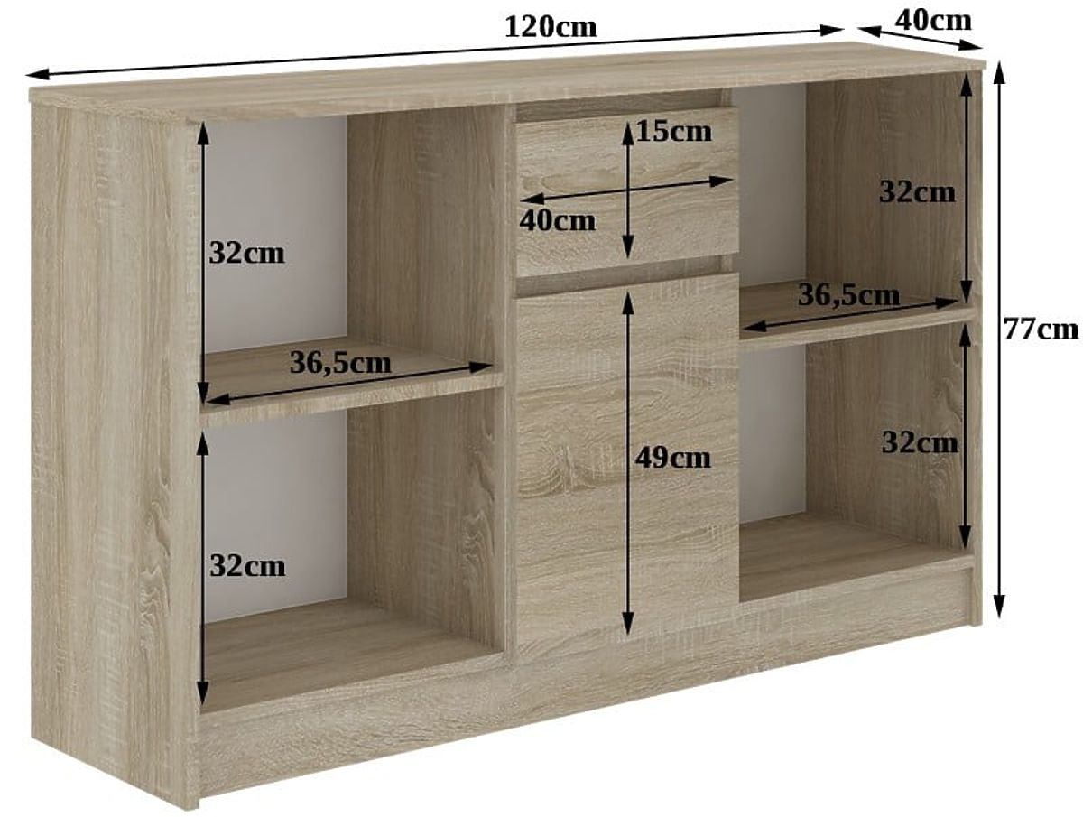 A bútor méretei 120 cm x 77 cm x 40 cm. Mindenki, aki vonzó, minőségi, de egyben megfizethető megoldást keres a berendezett helyiséghez, meghívjuk, hogy ismerkedjen meg közelebbről ezzel az érdekes ajánlattal. Reméljük, hogy megfelel a legigényesebb személyek elvárásainak is. A komód két nyitott polcból, egy ajtó mögötti polcból és egy fiókból áll. Az egész szépen mutat önállóan és más bútorokkal kombinálva is ebből a sorozatból. Meghívjuk a vásárlásra.