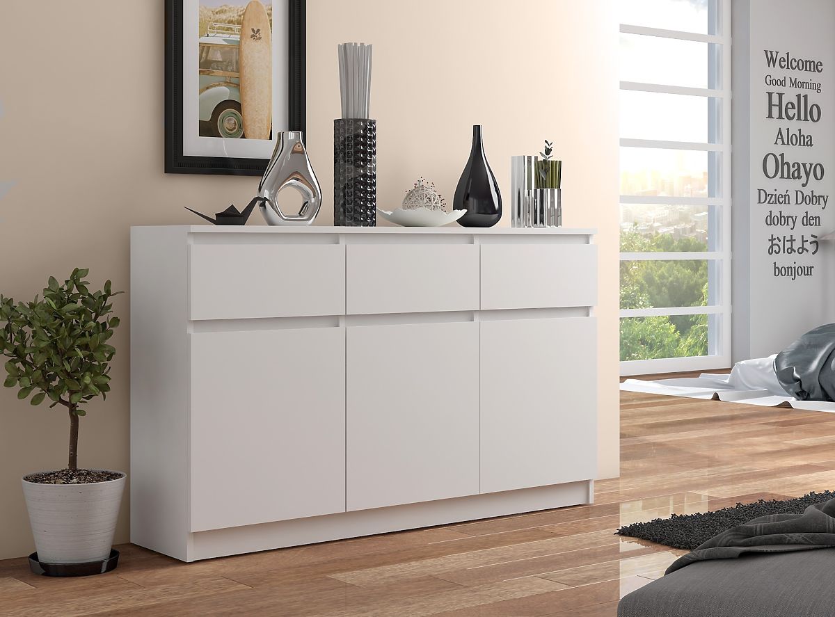 Bemutatjuk a rendkívül elegáns komódot, amely kiváló minőségű laminált lapból készült. Vastagsága 16 mm, és kopásálló. Az elismert Kronospan gyártótól származik, ami garantálja a tartósságát. A komód három fiókkal és három szekrénnyel rendelkezik. A fiókok fémgolyós síneken mozognak, ami biztosítja a sima és könnyű nyitást és zárást. Minden szekrény tágas polccal rendelkezik, amely ajtóval nyitható. A bútor élei ABS szegéllyel vannak borítva, amely magas védelmet nyújt a sérülések ellen.